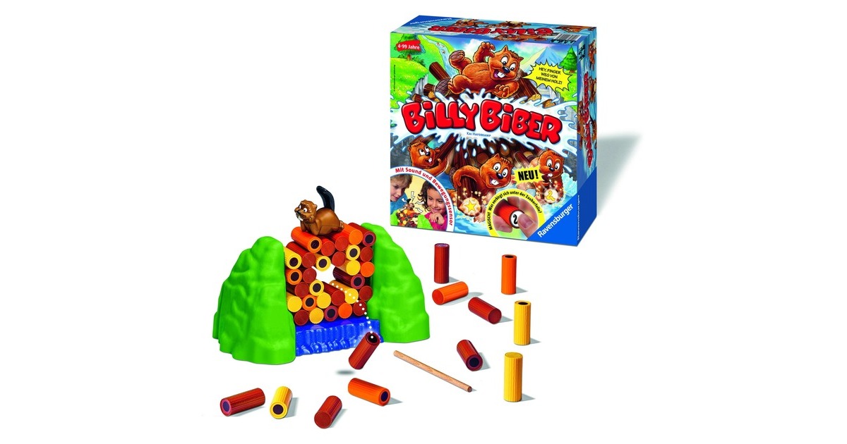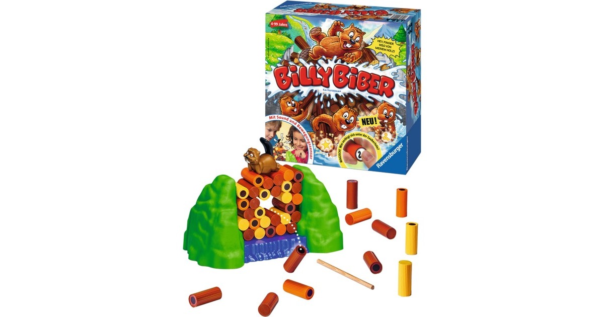 Bei Billy Biber versuchen die Biberkinder die Stämme zu stibitzen. Einen nach dem anderen schieben sie aus dem Holzstapel heraus - ganz vorsichtig, damit nichts wackelt! Sonst bemerkt Billy den dreisten Klau und meckert, was das Zeug hält. Doch aufgepasst! In einigen Stämmen haben sich Holzwürmer versteckt. So ein Pech! Denn nur die Stämme zählen, die als Symbol Jahresringe oder einen Stern tragen. Jetzt wird schnell nachgesehen, was die magische Zauberfolie zeigt. Die Spannung steigt! Art.-Nr.: 1187084