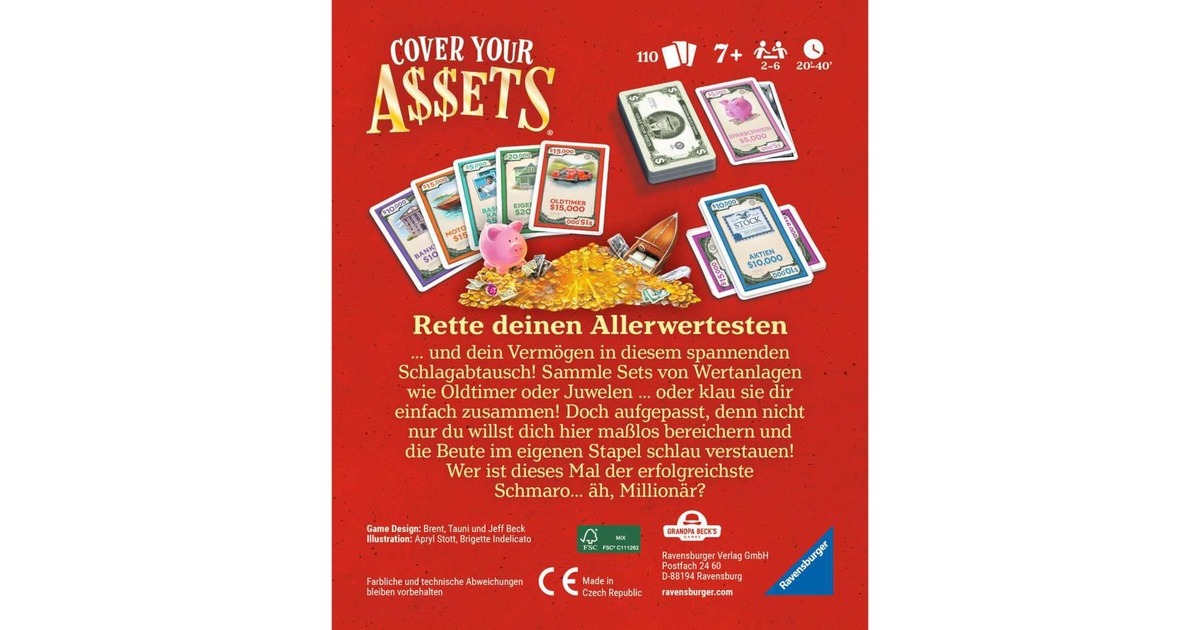 "Cover your Assets" von Ravensburger ist ein Kartenspiel rund um Wertanlagen wie zum Beispiel Oldtimer oder Juwelen. 2-6 Spieler sammeln Sets dieser Wertgegenstände - oder klauen sie sich zusammen. Und weil das alle tun, entsteht ein Wettkampf um den besten Stapel. Wer wird dieses Mal erfolgreich sammeln?Art.-Nr.: 100039156