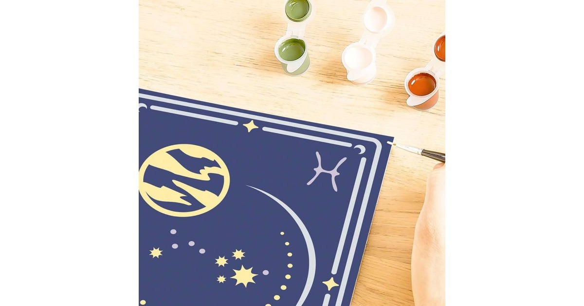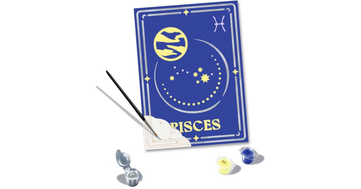 CreArt - das ist Malen nach Zahlen für Jugendliche und Erwachsene aus dem Hause Ravensburger. Jedes Set enthält alles, was zum Malen benötigt wird. Es ist kein Mischen der Farben notwendig. Motivlinien sind aufgedruckt und können einfach mit den Acrylfarben ausgemalt werden. Das ermöglicht schnelle Erfolgserlebnisse und lässt einen dekorativen Wandschmuck entstehen. Hinzu kommt die tolle Auswahl an Motiven in verschiedenen Größen. Mit diesem Set entsteht ein spirituelles Astrologie-Motiv des Sternzeichens Fische in der Größe 18 x 24 Zentimeter. Als besonderes Extra ist Silberfarbe und Leuchtfarbe enthalten, sodass das Motiv auch im Dunkeln leuchtet.Art.-Nr.: 100038972