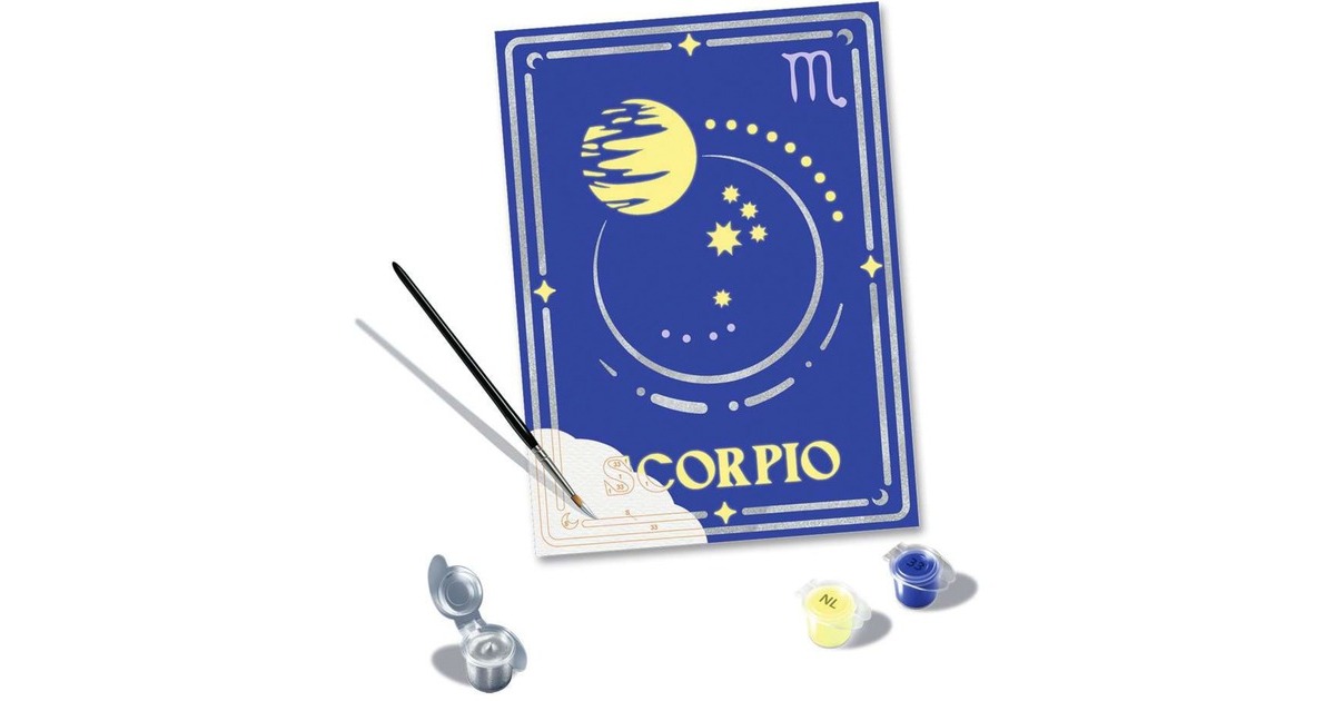 CreArt - das ist Malen nach Zahlen für Jugendliche und Erwachsene aus dem Hause Ravensburger. Jedes Set enthält alles, was zum Malen benötigt wird. Es ist kein Mischen der Farben notwendig. Motivlinien sind aufgedruckt und können einfach mit den Acrylfarben ausgemalt werden. Das ermöglicht schnelle Erfolgserlebnisse und lässt einen dekorativen Wandschmuck entstehen. Hinzu kommt die tolle Auswahl an Motiven in verschiedenen Größen. Mit diesem Set entsteht ein spirituelles Astrologie-Motiv des Sternzeichens Skorpion in der Größe 18 x 24 Zentimeter. Als besonderes Extra ist Silberfarbe und Leuchtfarbe enthalten, sodass das Motiv auch im Dunkeln leuchtet.Art.-Nr.: 100038986