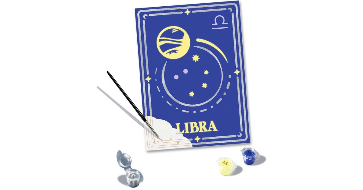CreArt - das ist Malen nach Zahlen für Jugendliche und Erwachsene aus dem Hause Ravensburger. Jedes Set enthält alles, was zum Malen benötigt wird. Es ist kein Mischen der Farben notwendig. Motivlinien sind aufgedruckt und können einfach mit den Acrylfarben ausgemalt werden. Das ermöglicht schnelle Erfolgserlebnisse und lässt einen dekorativen Wandschmuck entstehen. Hinzu kommt die tolle Auswahl an Motiven in verschiedenen Größen. Mit diesem Set entsteht ein spirituelles Astrologie-Motiv des Sternzeichens Waage in der Größe 18 x 24 Zentimeter. Als besonderes Extra ist Silberfarbe und Leuchtfarbe enthalten, sodass das Motiv auch im Dunkeln leuchtet.Art.-Nr.: 100038980