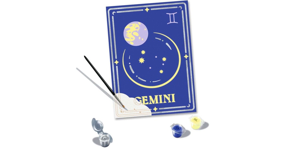 CreArt - das ist Malen nach Zahlen für Jugendliche und Erwachsene aus dem Hause Ravensburger. Jedes Set enthält alles, was zum Malen benötigt wird. Es ist kein Mischen der Farben notwendig. Motivlinien sind aufgedruckt und können einfach mit den Acrylfarben ausgemalt werden. Das ermöglicht schnelle Erfolgserlebnisse und lässt einen dekorativen Wandschmuck entstehen. Hinzu kommt die tolle Auswahl an Motiven in verschiedenen Größen. Mit diesem Set entsteht ein spirituelles Astrologie-Motiv des Sternzeichens Zwillinge in der Größe 18 x 24 Zentimeter. Als besonderes Extra ist Silberfarbe und Leuchtfarbe enthalten, sodass das Motiv auch im Dunkeln leuchtet.Art.-Nr.: 100039001