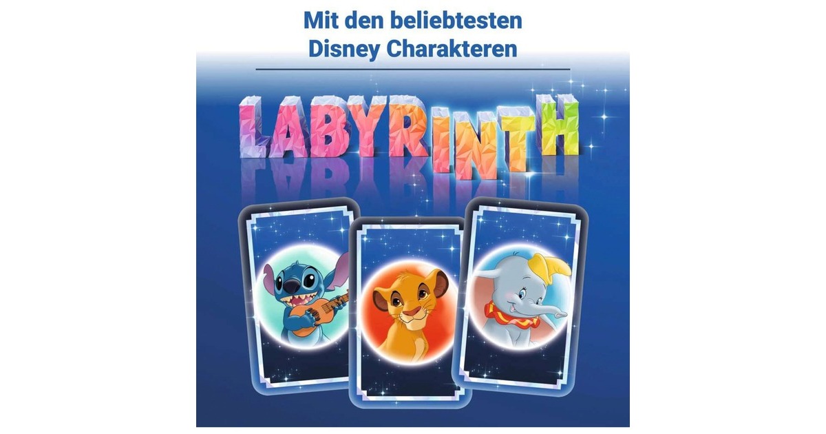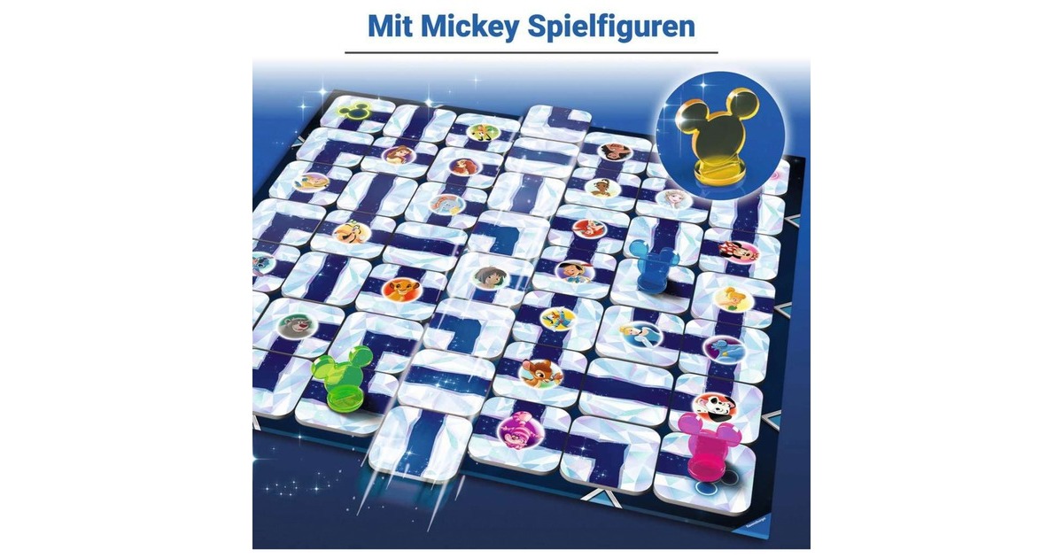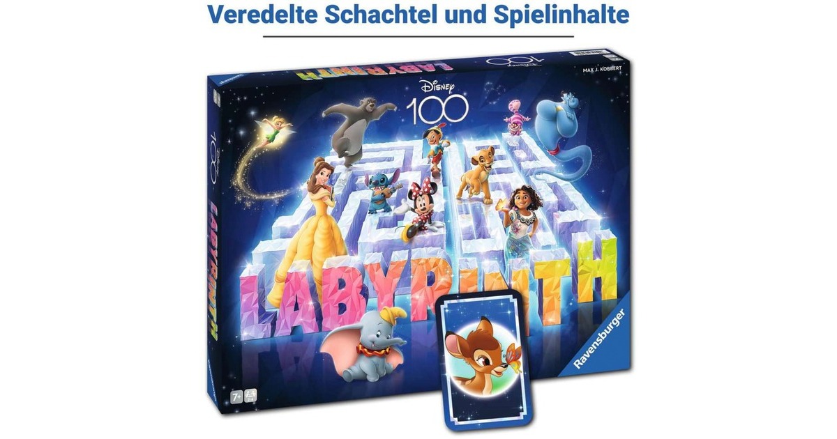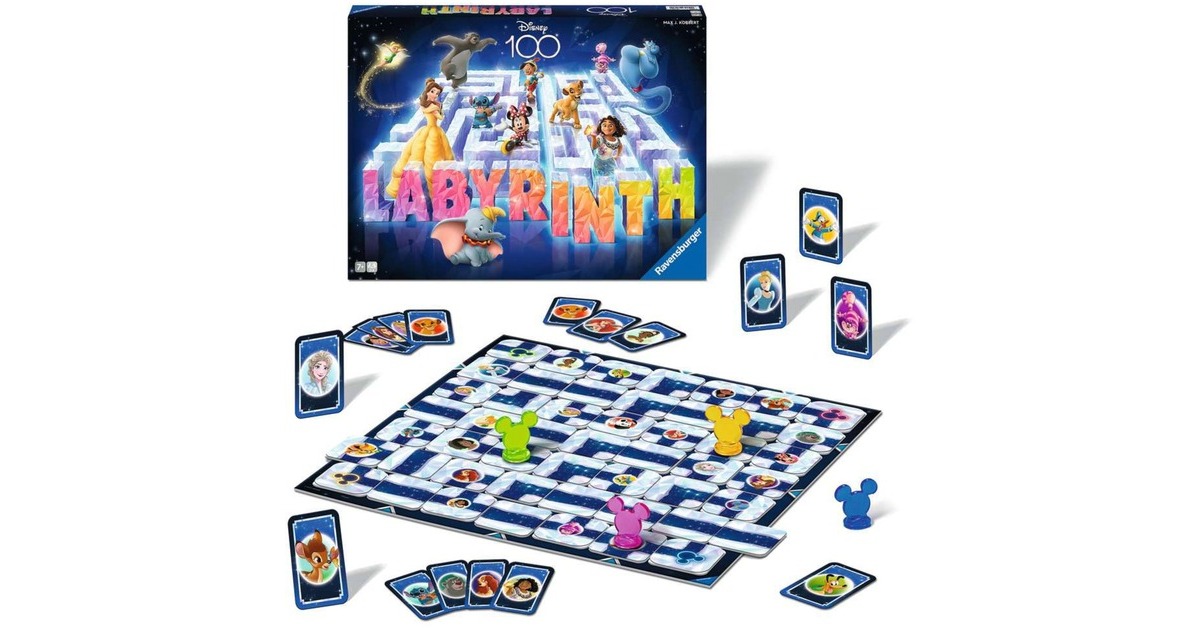 Disney 100 Labyrinth ist die Disney-Version eines beliebten Klassikers. Die Labyrinth-Karten werden beliebig auf dem Spielplan verteilt und es entsteht ein zufälliges Labyrinth. Eine Karte bleibt übrig, damit wird das Labyrinth verschoben. Wer an der Reihe ist, verschiebt zuerst das Labyrinth und zieht anschließend mit seiner Micky-Spielfigur auf den neu entstandenen Wegen voran, um den gesuchten Lieblingscharakter zu erreichen.