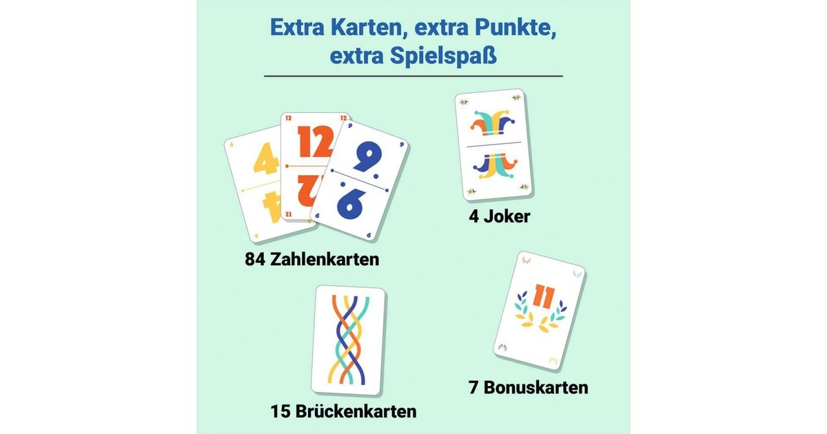 110 Karten (84 Zahlenkarten, 15 Brückenkarten, 7 Bonuskarten, 4 Joker), Spielanleitung |