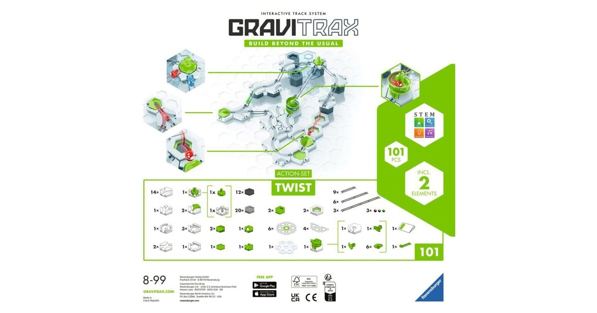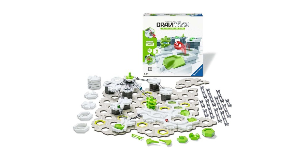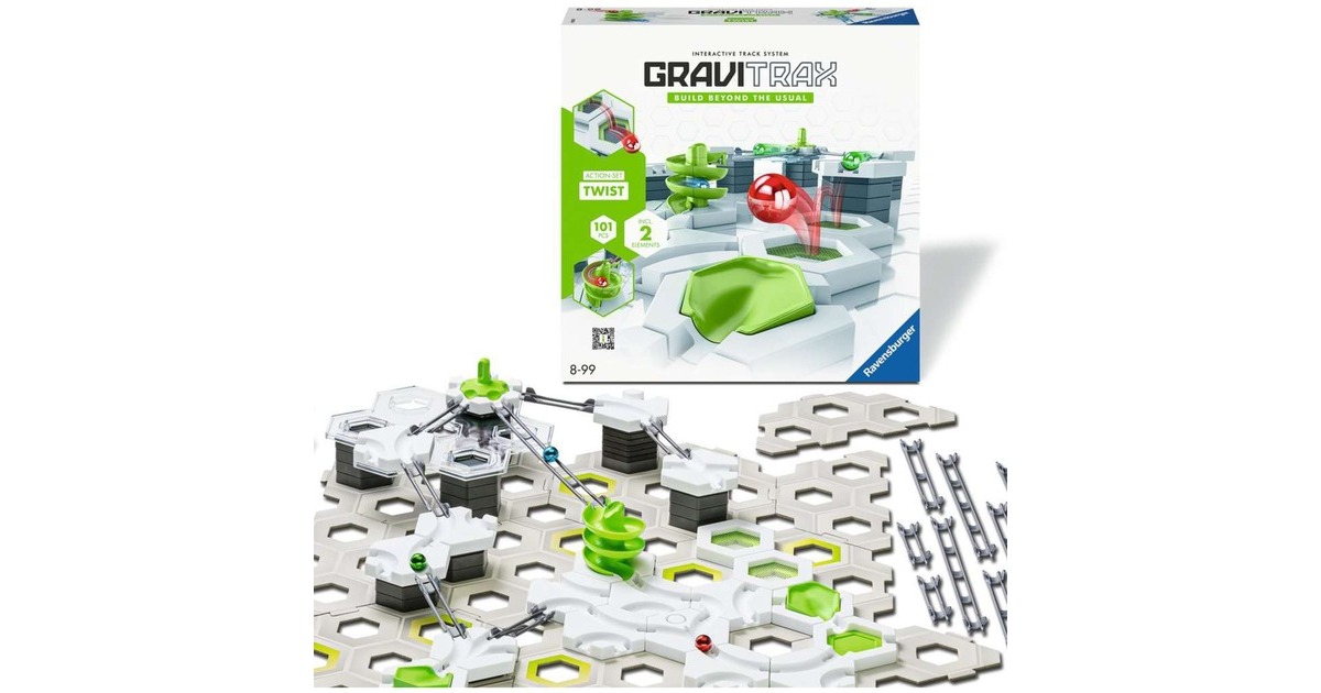 GraviTrax - das innovative Baukastensystem für anspruchsvolle Kugelbahnen. Aus einer Vielzahl an verschiedenen Bausteinen und Schienen lassen sich bei geschickter Nutzung der physikalischen Gesetze aktionsreiche Streckenverläufe planen, ausprobieren und realisieren. Mit den zahlreichen Erweiterungs-Sets wird das freie Bauen und Konstruieren des innovativen Bausystems GraviTrax jedes Mal aufs Neue noch interessanter und spannender! Mit dem GraviTrax Action-Set Twist können abwechslungsreiche und individuelle Bahnen geschaffen werden. Die enthaltenen Action-Elemente ermöglichen jede Menge Bauspaß: Die Spirale lässt Kugeln in rasantem Tempo Höhenunterschiede überwinden, kann in ihrer Höhe individuell zusammengebaut werden und passt sich so jeder Bahn perfekt an. Das Trampolin bringt neuen Schwung und Energie: So entsteht ein Spiel mit der Schwerkraft! Wie hoch und weit können die Kugeln springen?Art.-Nr.: 100038488