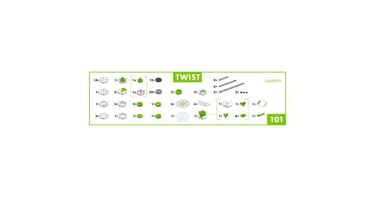1 Anleitungs- und Bauplanheft, 6 hexagonale Bodenplatten, 4 halbe hexagonale Bodenplatten, 1 Balls & Spinner, 20 ganze Höhensteine, 12 halbe Höhensteine, 14 Kurven, 2 Kreuzungen, 2 Weichen, 1 3-in-1, 1 Wirbel, 1 Ziel, 1 Zielleiter, 2 Fänger, 1 Freifall, 1 Splash, 3 Basissteine offen, 1 Kugel blau, 1 Kugel rot, 1 Kugel grün, 3 Schienen lang, 6 Schienen mittel, 9 Schienen kurz, 1 kleine transparente Ebene, 2 Trampoline, 2 Höhenstein-Winkel, 1 Spirale |