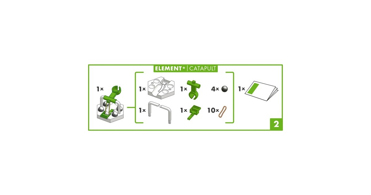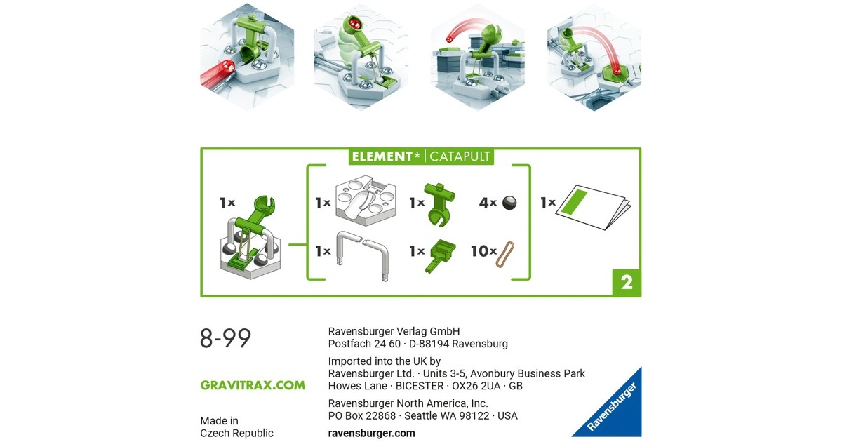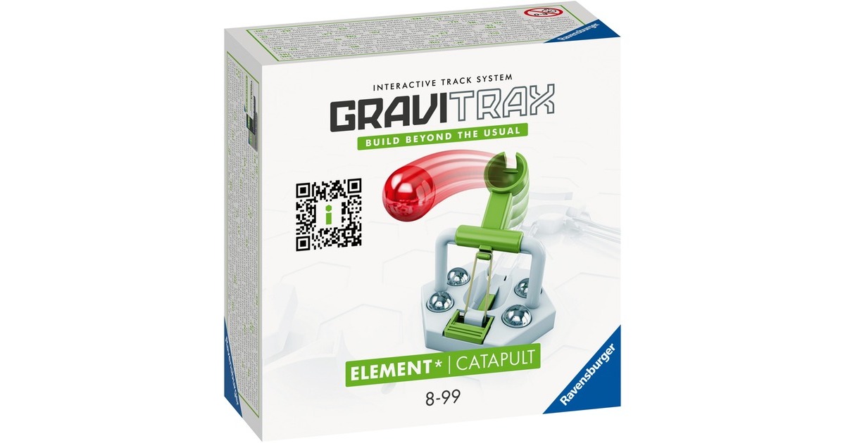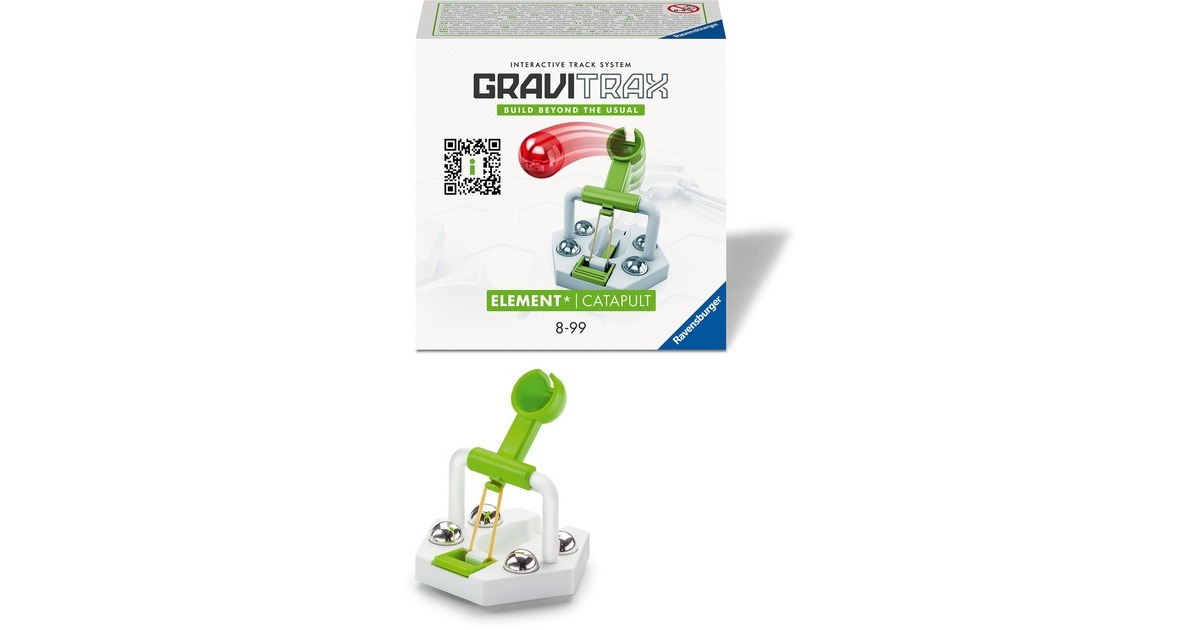 GraviTrax - das innovative Baukastensystem für anspruchsvolle Kugelbahnen. Aus einer Vielzahl an verschiedenen Bausteinen und Schienen lassen sich bei geschickter Nutzung der physikalischen Gesetze aktionsreiche Streckenverläufe planen, ausprobieren und realisieren. Mit den zahlreichen Erweiterungs-Sets wird das freie Bauen und Konstruieren des innovativen Bausystems GraviTrax jedes Mal aufs Neue noch interessanter und spannender! Mehr Möglichkeiten - mehr Spaß! Mit dem Element Catapult spielt die Schwerkraft keine Rolle mehr und die Kugeln fliegen über die Bahn: Dadurch können Hindernisse und Höhenunterschiede auf spektakuläre Weise überwunden werden. Rollt eine Kugel in das Catapult, löst sich ein Hebel und der Arm mit der Kugel schießt nach oben. Dieses Element bringt, wenn es mit einem Starter-Set kombiniert oder in eine bereits aufgebaute GraviTrax-Welt integriert wird, ganz neuen Schwung und viele neue Möglichkeiten.Art.-Nr.: 1913122