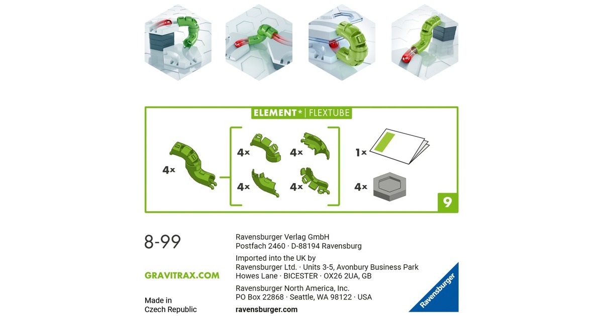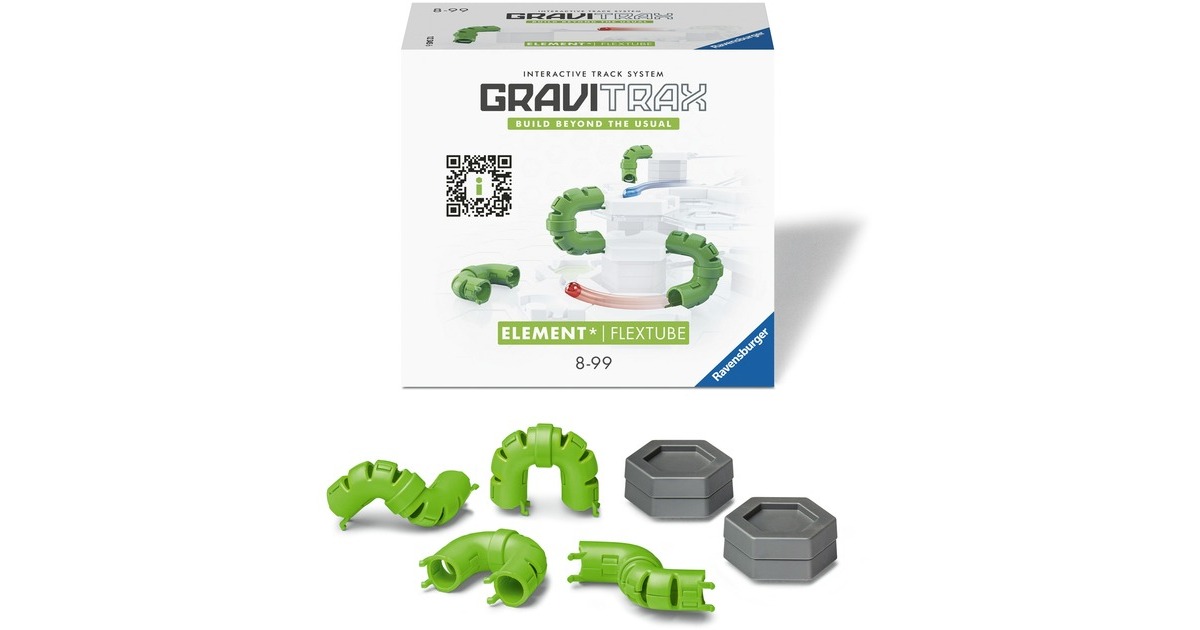 GraviTrax - das innovative Baukastensystem für anspruchsvolle Kugelbahnen. Aus einer Vielzahl an verschiedenen Bausteinen und Schienen lassen sich bei geschickter Nutzung der physikalischen Gesetze aktionsreiche Streckenverläufe planen, ausprobieren und realisieren. Mit den zahlreichen Erweiterungs-Sets wird das freie Bauen und Konstruieren des innovativen Bausystems GraviTrax jedes Mal aufs Neue noch interessanter und spannender! Mehr Möglichkeiten - mehr Spaß! Mit dem Element FlexTube lassen sich verschiedene Höhen flexibel miteinander verbinden. Durch leichtes Drehen kann die FlexTube in 60-Grad-Schritten in verschiedene Formen gebracht werden. So lassen sich auch knifflige Stellen leicht überwinden. Dieses Element bringt, wenn es mit einem Starter-Set kombiniert oder in eine bereits aufgebaute GraviTrax-Welt integriert wird, ganz neuen Schwung und viele neue Möglichkeiten.Art.-Nr.: 1913160