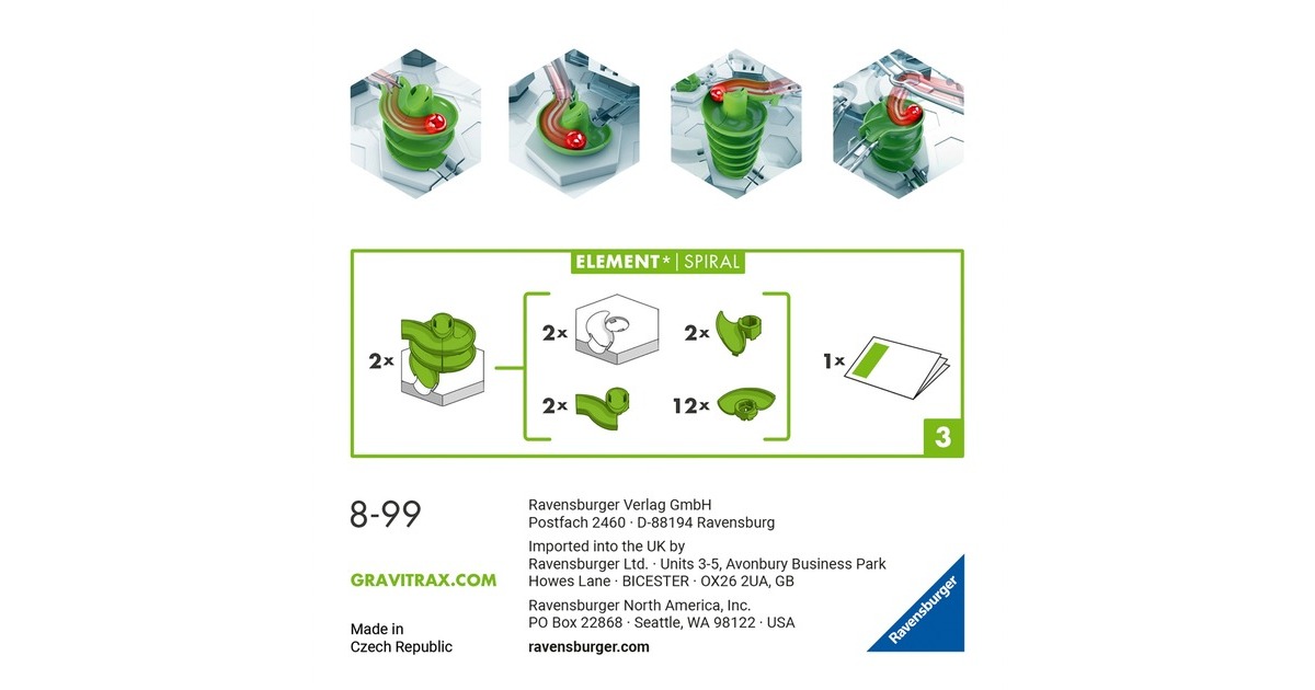 GraviTrax - das innovative Baukastensystem für anspruchsvolle Kugelbahnen. Aus einer Vielzahl an verschiedenen Bausteinen und Schienen lassen sich bei geschickter Nutzung der physikalischen Gesetze aktionsreiche Streckenverläufe planen, ausprobieren und realisieren. Mit den zahlreichen Erweiterungs-Sets wird das freie Bauen und Konstruieren des innovativen Bausystems GraviTrax jedes Mal aufs Neue noch interessanter und spannender! Mehr Möglichkeiten - mehr Spaß! Mit dem Element Spiral können Kugeln besonders große Höhen überwinden. Die Spirale kann in der Höhe individuell zusammengebaut werden und damit perfekt an eine Bahn angepasst werden. Dieses Element bringt, wenn es mit einem Starter-Set kombiniert oder in eine bereits aufgebaute GraviTrax-Welt integriert wird, ganz neuen Schwung und viele neue Möglichkeiten.Art.-Nr.: 1913147