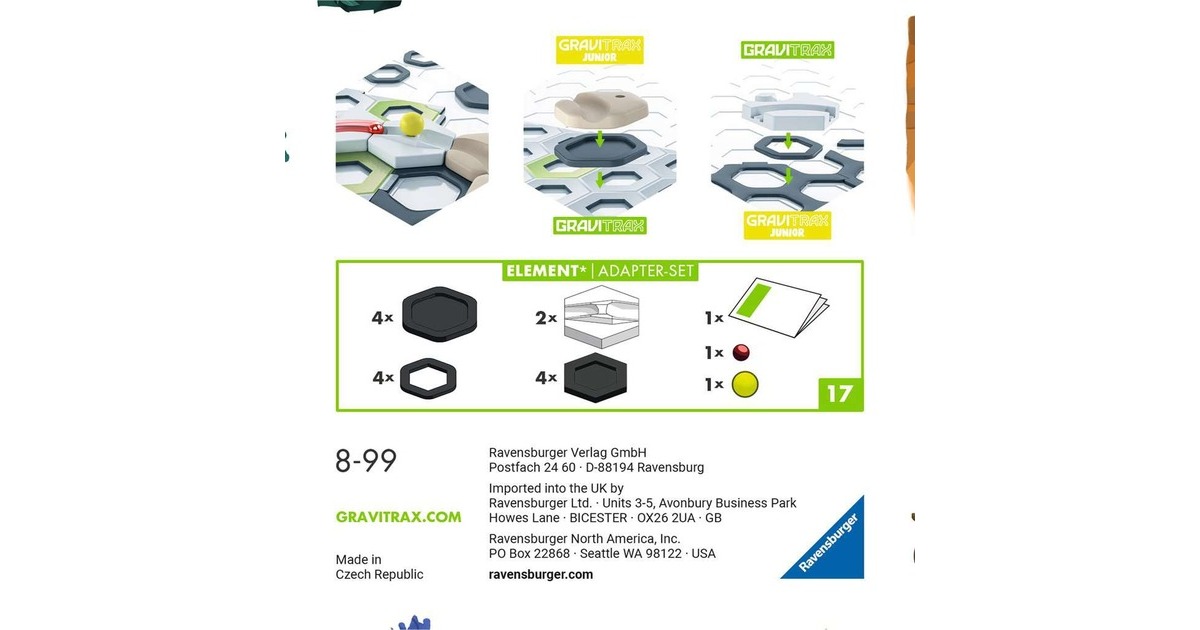 GraviTrax - das innovative Baukastensystem für anspruchsvolle Kugelbahnen. Aus einer Vielzahl an verschiedenen Bausteinen und Schienen lassen sich bei geschickter Nutzung der physikalischen Gesetze aktionsreiche Streckenverläufe planen, ausprobieren und realisieren. Mit den zahlreichen Erweiterungs-Sets wird das freie Bauen und Konstruieren des innovativen Bausystems GraviTrax jedes Mal aufs Neue noch interessanter und spannender! Diese Erweiterung enthält Adapter, um GraviTrax-Bahnen mit Teilen aus der Serie GraviTrax Junior zu verbinden - so lassen sich noch längere Streckenverläufe über verschiedene Serien hinweg planen!Art.-Nr.: 100038567
