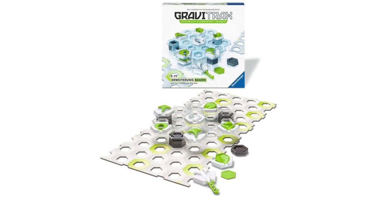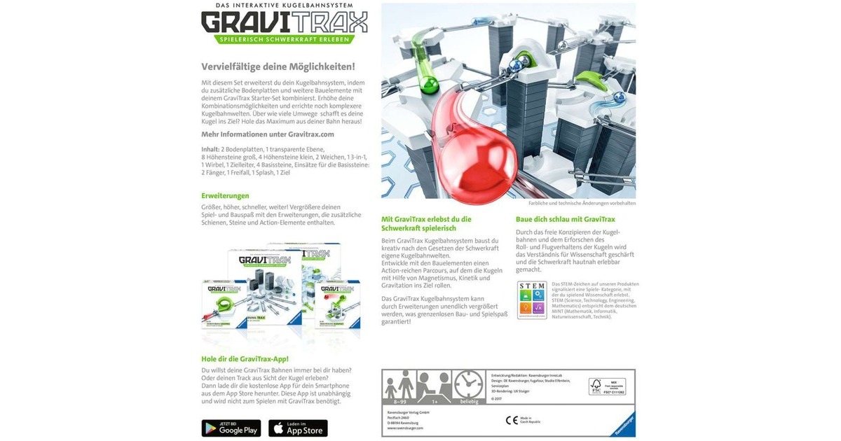 GraviTrax - das innovative Baukastensystem für anspruchsvolle Kugelbahnen. Aus einer Vielzahl an verschiedenen Bausteinen und Schienen lassen sich bei geschickter Nutzung der physikalischen Gesetze aktionsreiche Streckenverläufe planen, ausprobieren und realisieren. Mit den zahlreichen Erweiterungs-Sets wird das freie Bauen und Konstruieren des innovativen Bausystems GraviTrax jedes Mal aufs Neue noch interessanter und spannender! Mehr Möglichkeiten - mehr Spaß! Diese Erweiterung zu einem bereits bestehenden Starter-Set enthält eine Bodenplatte und eine transparente Ebene sowie weitere Bauteile, die eine noch variablere Streckenführung ermöglichen.Art.-Nr.: 1349099