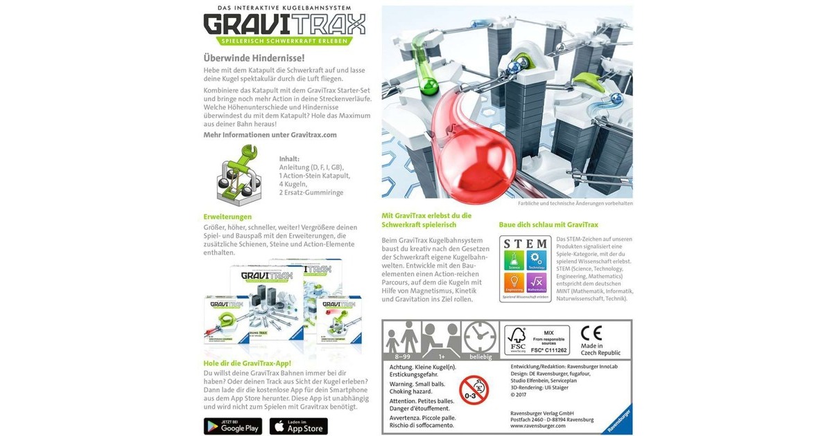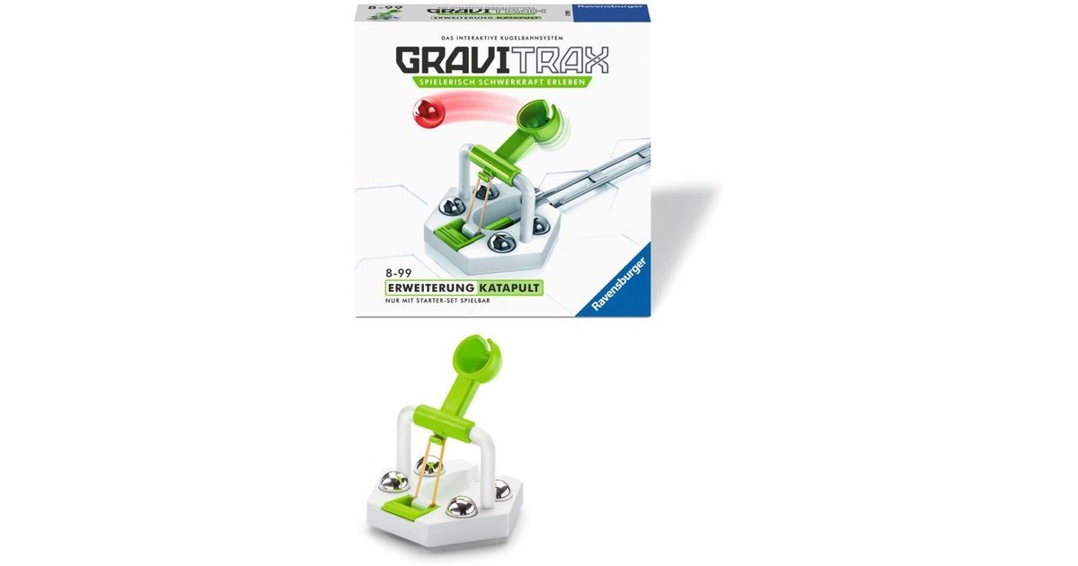 GraviTrax - das innovative Baukastensystem für anspruchsvolle Kugelbahnen. Aus einer Vielzahl an verschiedenen Bausteinen und Schienen lassen sich bei geschickter Nutzung der physikalischen Gesetze aktionsreiche Streckenverläufe planen, ausprobieren und realisieren. Mit den zahlreichen Erweiterungs-Sets wird das freie Bauen und Konstruieren des innovativen Bausystems GraviTrax jedes Mal aufs Neue noch interessanter und spannender! Mehr Möglichkeiten - mehr Spaß! Diese Erweiterung zu einem bereits bestehenden Starter-Set enthält ein Katapult, mit dem Kugeln in eine bestimmte Richtung geschleudert werden können.Art.-Nr.: 1349082