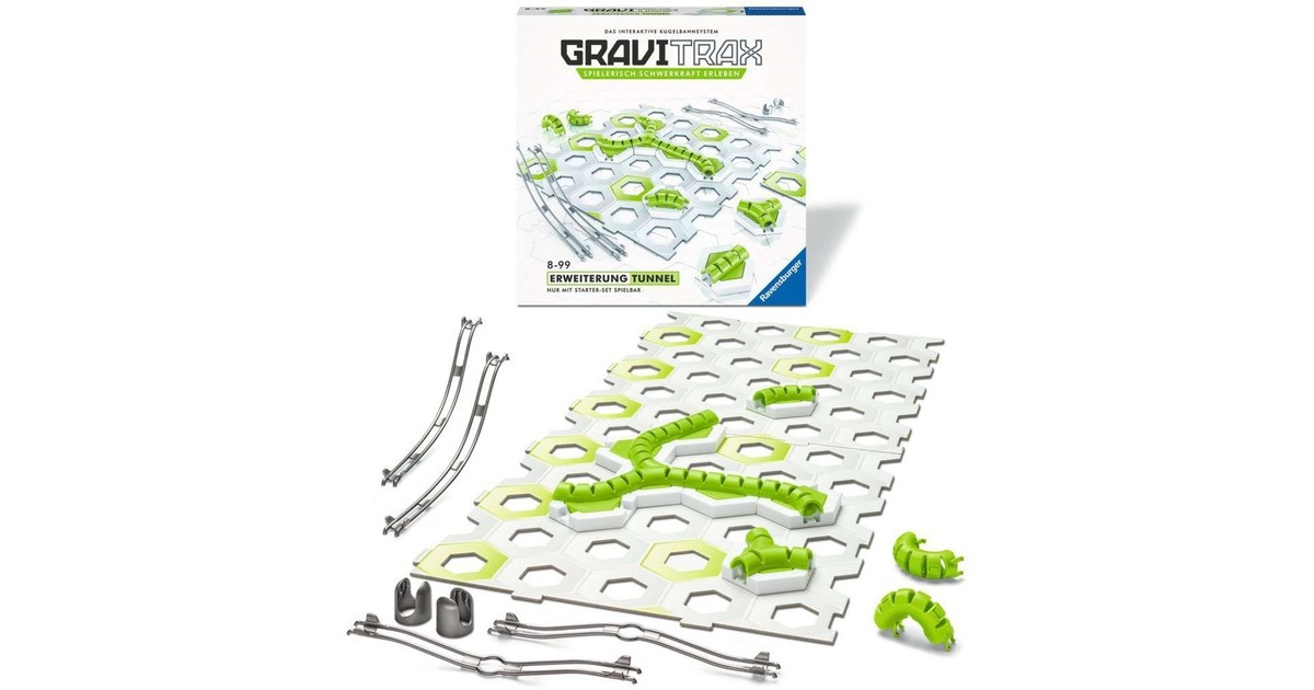 GraviTrax - das innovative Baukastensystem für anspruchsvolle Kugelbahnen. Aus einer Vielzahl an verschiedenen Bausteinen und Schienen lassen sich bei geschickter Nutzung der physikalischen Gesetze aktionsreiche Streckenverläufe planen, ausprobieren und realisieren. Mit den zahlreichen Erweiterungs-Sets wird das freie Bauen und Konstruieren des innovativen Bausystems GraviTrax jedes Mal aufs Neue noch interessanter und spannender! Mehr Möglichkeiten - mehr Spaß! Diese Erweiterung enthält einen Tunnel und weitere zusätzliche Schienen. Sie bietet damit ganz neue Kombinations- und Beschleunigungsmöglichkeiten.Art.-Nr.: 1435165