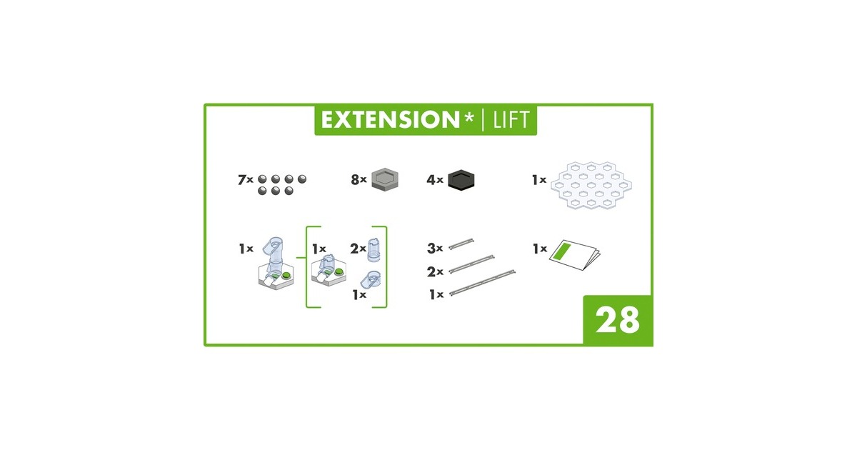 Anleitung, 1 Element Lift, 7 Kugeln, 8 ganze Höhensteine, 4 halbe Höhensteine, 3 kurze Schienen, 2 halbe Schienen, 1 lange Schiene, 1 transparente Ebene |