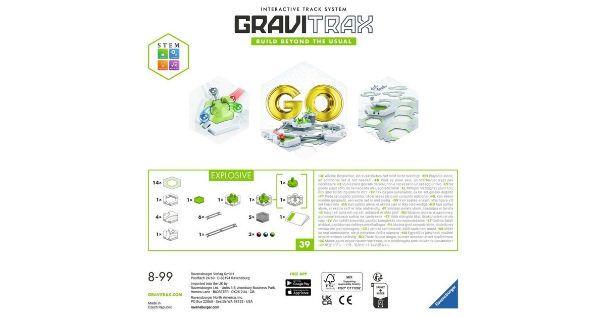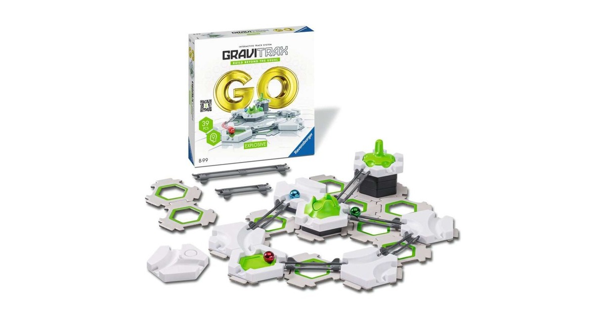 GraviTrax - das innovative Baukastensystem für anspruchsvolle Kugelbahnen. Aus einer Vielzahl an verschiedenen Bausteinen und Schienen lassen sich bei geschickter Nutzung der physikalischen Gesetze aktionsreiche Streckenverläufe planen, ausprobieren und realisieren. Mit den zahlreichen Erweiterungs-Sets wird das freie Bauen und Konstruieren des innovativen Bausystems GraviTrax jedes Mal aufs Neue noch interessanter und spannender! Das Starterset GraviTrax GO Explosive ist für Einsteiger in das GraviTrax-Universum gemacht: Kinder ab 8 Jahren können mit einer breiten Palette an Teilen einfach auspacken und sofort loslegen. Art.-Nr.: 100038538