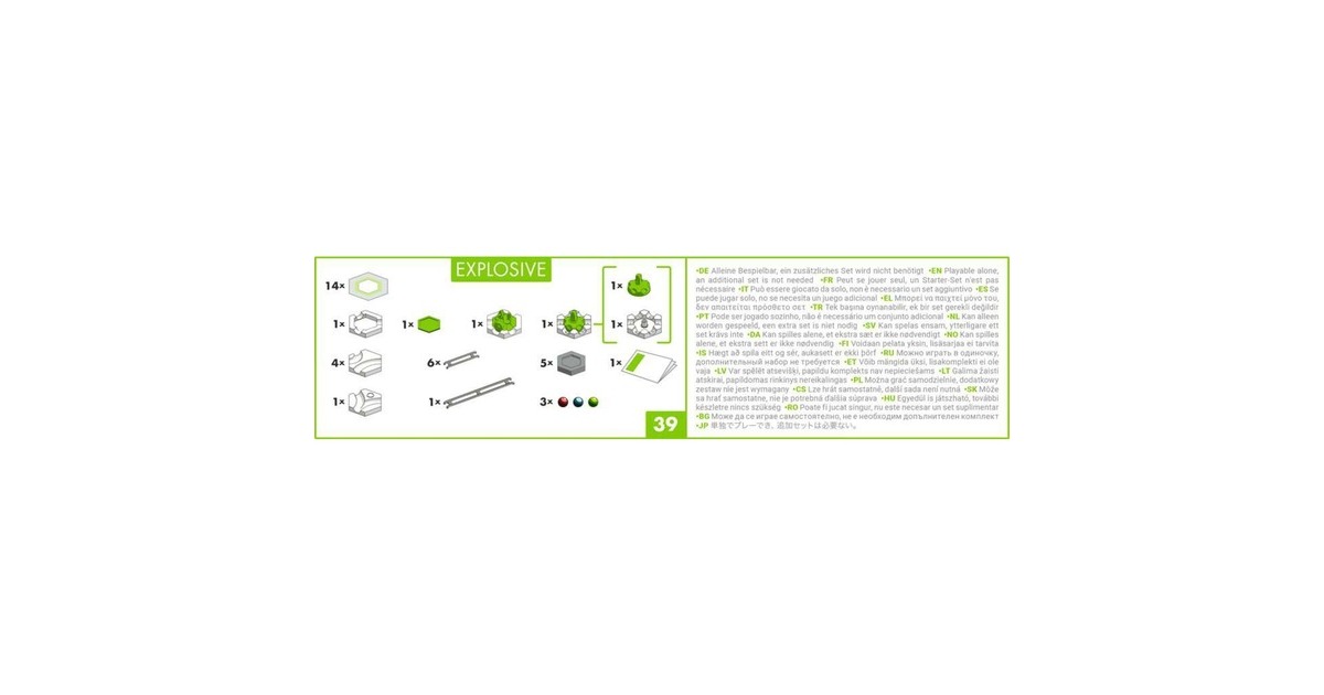 1 Anleitungsheft, 14 kleine hexagonale Grundplatten, 1 Balls & Spinner, 1 Kugel blau, 1 Kugel rot, 1 Kugel grün, 1 Ziel, 4 Kurven, 1 2-in-1, 1 Schiene mittel, 6 Schienen kurz, 5 ganze Höhensteine, 1 Vulcano |