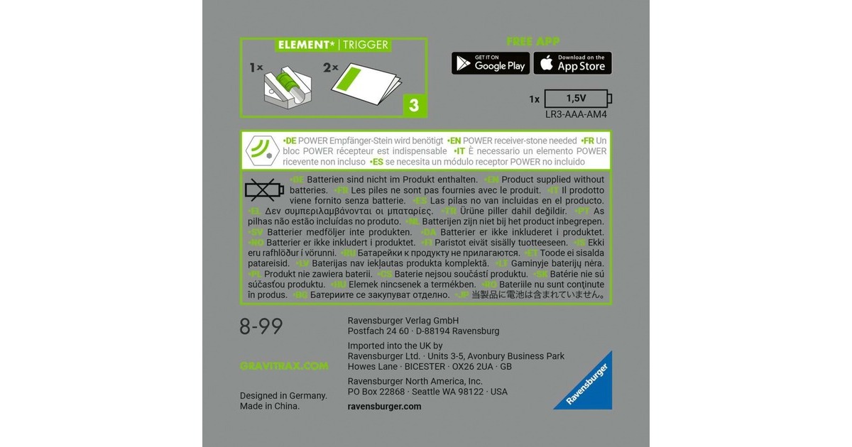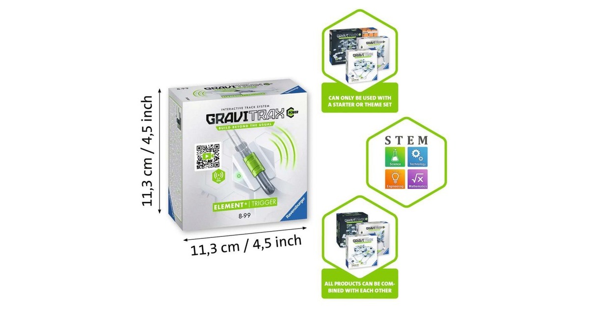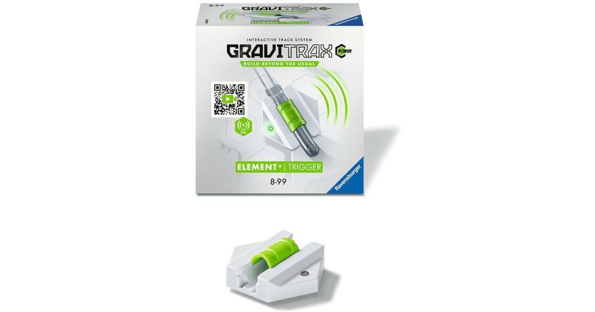 GraviTrax - das innovative Baukastensystem für anspruchsvolle Kugelbahnen. Aus einer Vielzahl an verschiedenen Bausteinen und Schienen lassen sich bei geschickter Nutzung der physikalischen Gesetze aktionsreiche Streckenverläufe planen, ausprobieren und realisieren. Mit den zahlreichen Erweiterungs-Sets wird das freie Bauen und Konstruieren des innovativen Bausystems GraviTrax jedes Mal aufs Neue noch interessanter und spannender! Mehr Möglichkeiten - mehr Spaß! Mit dem Trigger können in Kombination mit anderen POWER Steinen, wie Switch, Starter oder Lever (jeweils separat erhältlich), unsichtbare Verbindungen geschaffen werden.Art.-Nr.: 1894527