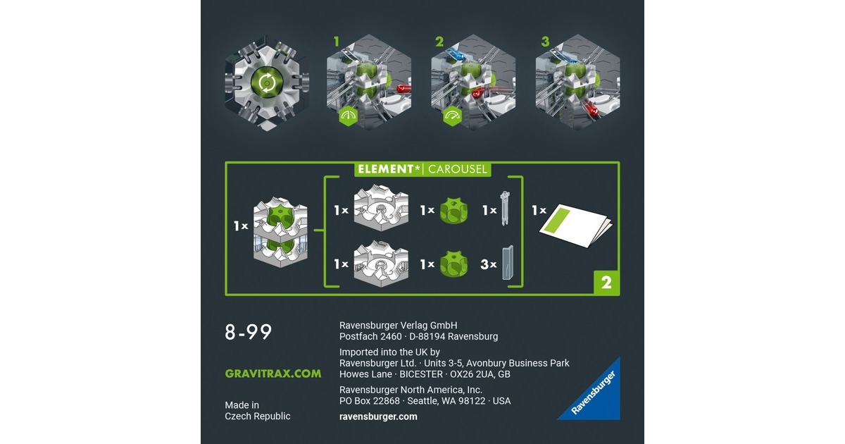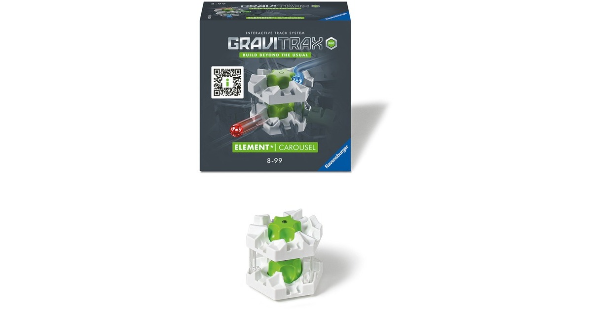 GraviTrax - das innovative Baukastensystem für anspruchsvolle Kugelbahnen. Aus einer Vielzahl an verschiedenen Bausteinen und Schienen lassen sich bei geschickter Nutzung der physikalischen Gesetze aktionsreiche Streckenverläufe planen, ausprobieren und realisieren. Mit den zahlreichen Erweiterungs-Sets wird das freie Bauen und Konstruieren des innovativen Bausystems GraviTrax jedes Mal aufs Neue noch interessanter und spannender! Mehr Möglichkeiten - mehr Spaß! Durch das Element Carousel aus der PRO-Serie werden zwei Ebenen über mehrere Ein- und Ausgänge miteinander verbunden: Der Stein kann während eines Durchlaufs mehrfach genutzt werden. Hineinrollende Kugeln können entweder im Carousel verbleiben oder dieses starten lassen, wodurch die geparkten Kugeln auf die Bahn geschickt werden. Dieses Element bringt, wenn es mit einem Starter-Set kombiniert oder in eine bereits aufgebaute GraviTrax-Welt integriert wird, ganz neuen Schwung und viele neue Möglichkeiten. Art.-Nr.: 1913168