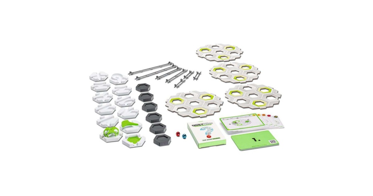 1 Anleitungs- und Lösungsheft, 30 Aufgabenkarten, 4 hexagonale Bodenplatten, 1 Startstein, 2 Kugeln, 6 Höhensteine groß, 8 neue Kurvensteine, 2 Kunststoffschienen lang, 2 Kunststoffschienen mittel, 3 Kunststoffschienen kurz, 1 Weiche, 1 3-in-1, 1 Basisstein, Einsätze für den Basisstein: 1 Ziel |