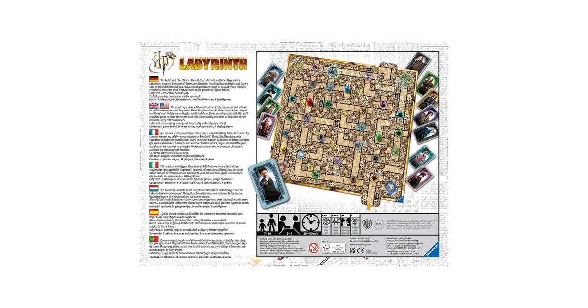 Viele Bewohner von Hogwarts, der Schule für Hexerei und Zauberei, verstecken sich im verrückten Labyrinth von Ravensburger. Entdeckt Harry Potter und seine Mitschüler: Ron Weasley, Hermine Granger,... und Fiesling Draco Malfoy. Aber auch Harrys Lehrer: Prof. Dumbledore, Severius Snape, Remus Lupin,... oder Dolores Umbridge sind in den verwinkelten Gängen des Labyrinths zu finden. Mit Hilfe der verschiebbaren Labyrinth-Kärtchen verändern die Spieler das Labyrinth bei jedem Spielzug und es entstehen neue Wege oder auch Sackgassen. Wer dabei den Überblick bewahrt, wird sich Wege zu den jeweils gesuchten Figuren aus der Welt von Harry Potter bahnen und am Ende das Spiel gewinnen. Labyrinth ist ein Such- und Schiebespiel mit genial einfachem und einzigartigem Spielprinzip! Einfach ein Kultspiel mit grenzenlosem Spielspaß für die ganze Familie!Art.-Nr.: 1545767