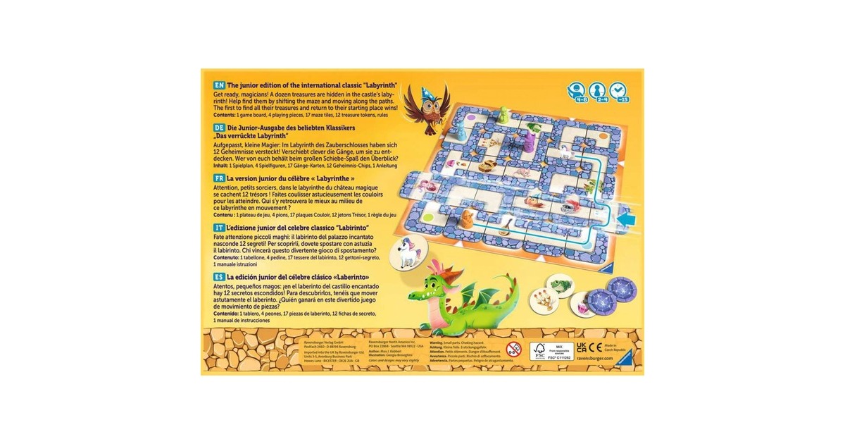 Bei diesem Brettspiel bleibt nichts wie es war: Ständig verschieben sich Wände und Gänge. Die Spieler entdecken Geheimnisse, die sich hinter den dicken Mauern verbergen. Kärtchen müssen verschoben werden und neue Wege und Gänge öffnen sich. Wichtig ist nur, dass man bei jedem Abenteuer immer die Übersicht behält, denn der Spieler, der die meisten Geheimnisse gefunden hat, steht am Ende als Sieger da. Für geübte Spieler enthält dieses Junior-Spiel auch eine Profi-Variante mit etwas schwierigeren Regeln.Art.-Nr.: 1828873