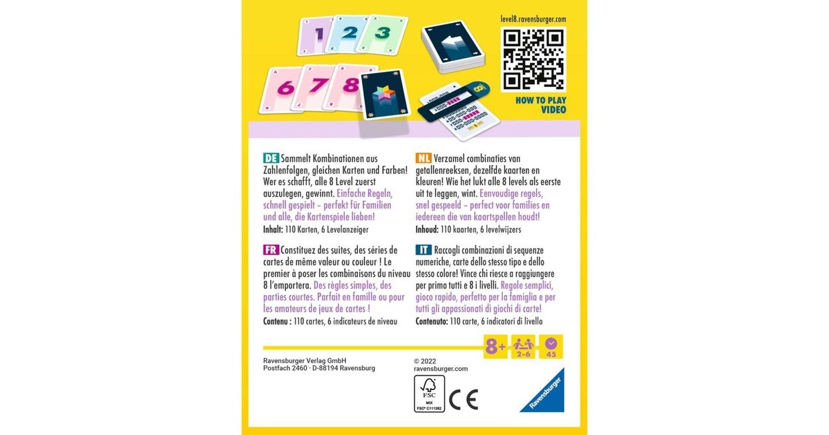 Bei Level 8 wetteifern zwei bis sechs Spieler Level für Level um den Sieg. Zu Beginn bekommt jeder Mitspieler eine Level-Karte mit allen acht Aufgaben sowie einen Level-Anzeiger, der angibt in welchem Level man sich gerade befindet. Wer legt die geforderten Kombinationen aus Zahlenfolgen, gleichen Karten und gleichen Farben am schnellsten aus? Einfache Regeln und der Zwang zu schnellen Entscheidungen bringen bei diesem Kartenspiel großen Spielspaß.Art.-Nr.: 1828791