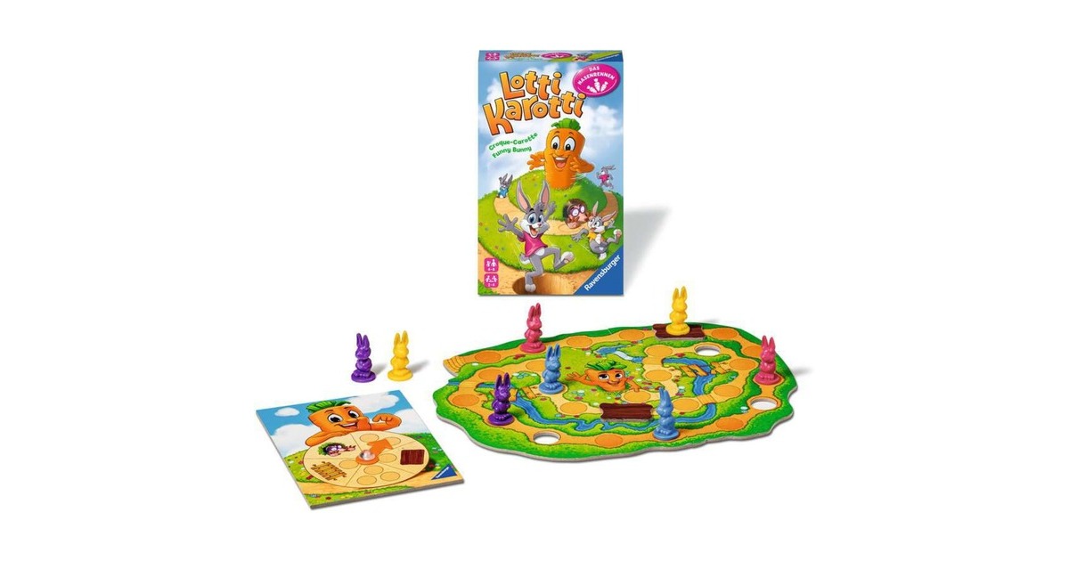 Acht kleine Hasen starten zum spannenden Wettrennen zur Karotte. Wie weit sie hüpfen dürfen, bestimmt das Glücksrad, das die Spieler in jedem Zug drehen: Landen sie bei ihrer Aktion auf einem sicheren Feld oder – hoppla – in einem gefährlichen Loch? Der kleine Maulwurf schubst einen beliebigen Mitspieler ein Feld zurück und wer eine Brücke vor sich liegen hat, darf eine Abkürzung nehmen. Mit einem Brett kann ein offenes Loch wieder begehbar gemacht werden - oder man kann sogar den Weg abkürzen, indem man eine Brücke repariert. So bleibt es spannend bis zum Schluss! Dieses Hasenrennen ist eine lustige Variante von Lotti Karotti, das nicht nur Lotti Karotti-Liebhaber ab 4 Jahren, sondern die ganze Familie begeistert.Art.-Nr.: 1894559