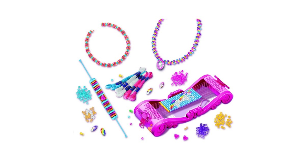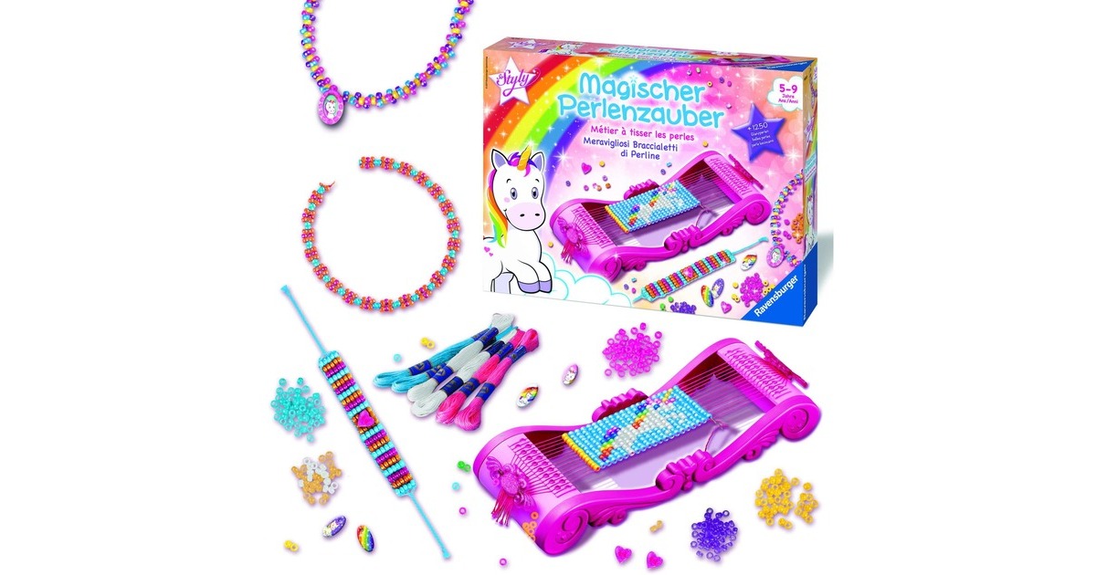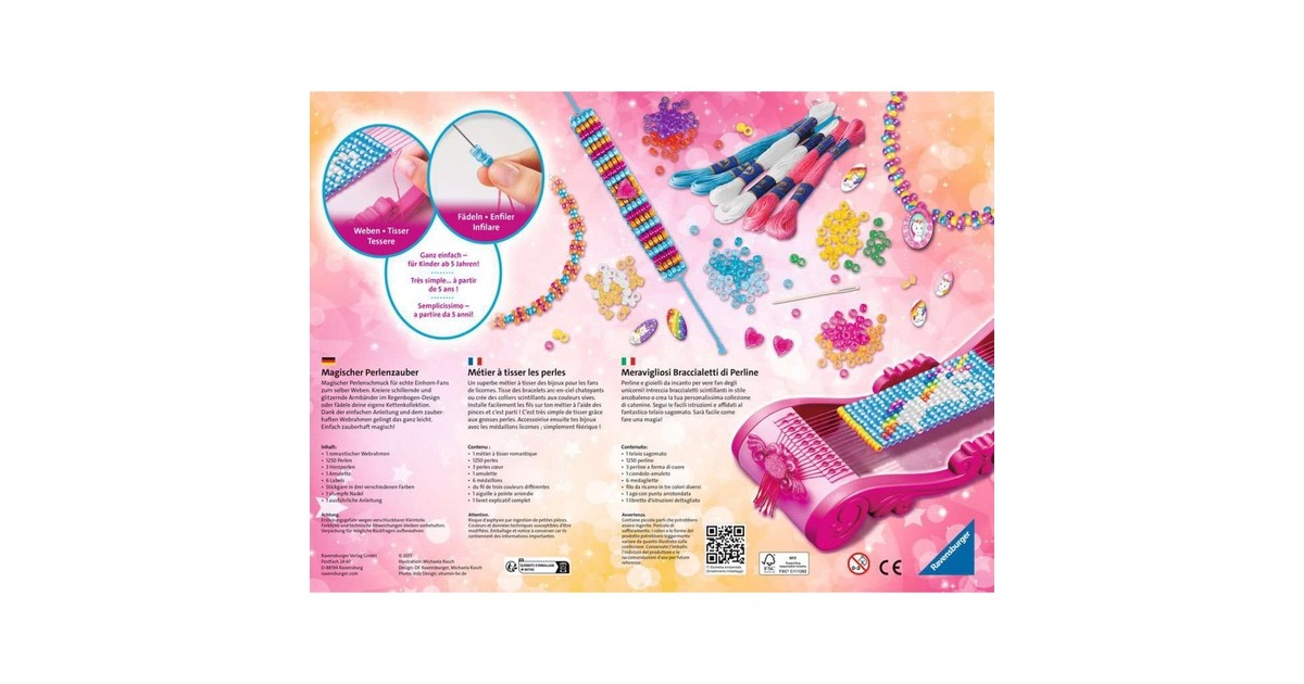Magischer Perlenschmuck für echte Einhorn-Fans zum selber Weben. Bastele schillernde und glitzernde Armbänder im Regenbogen-Design oder fädele deine eigene Kettenkollektion. Dank der einfachen Anleitung und dem zauberhaften Webrahmen gelingt das ganz leicht. Einfach zauberhaft magisch!Art.-Nr.: 1345731