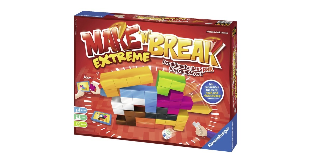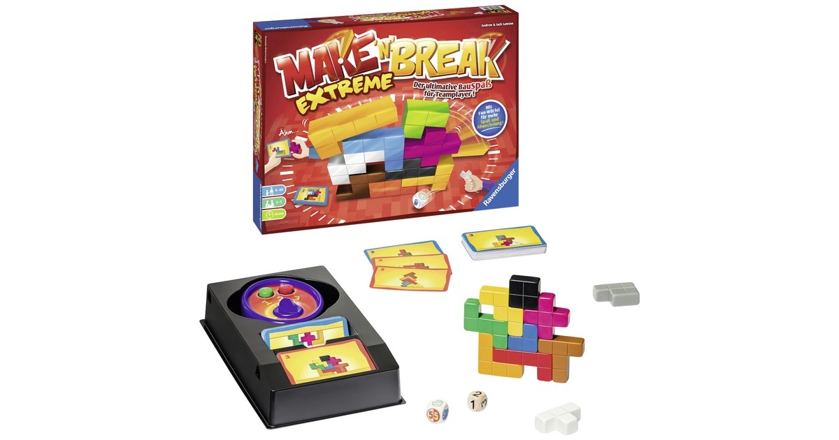 Das Bauspiel des Jahrzehnts – jetzt in einer Extreme-Edition. In dem neuen Make 'n' Break Extreme-Spiel baut und punktet ihr gemeinsam. Aber Vorsicht: Gewinnen wird weiterhin nur einer! Über 150 neue Aufgaben und der brandneue Fun-Würfel mit knifflig-pfiffigen Spielvarianten bieten viel Abwechslung und großen Spielspaß. Und natürlich könnt ihr auch weiterhin die klassische Variante spielen! Mehr Spaß! Mehr Abwechslung! Mehr Make 'n' Break!Art.-Nr.: 1349128