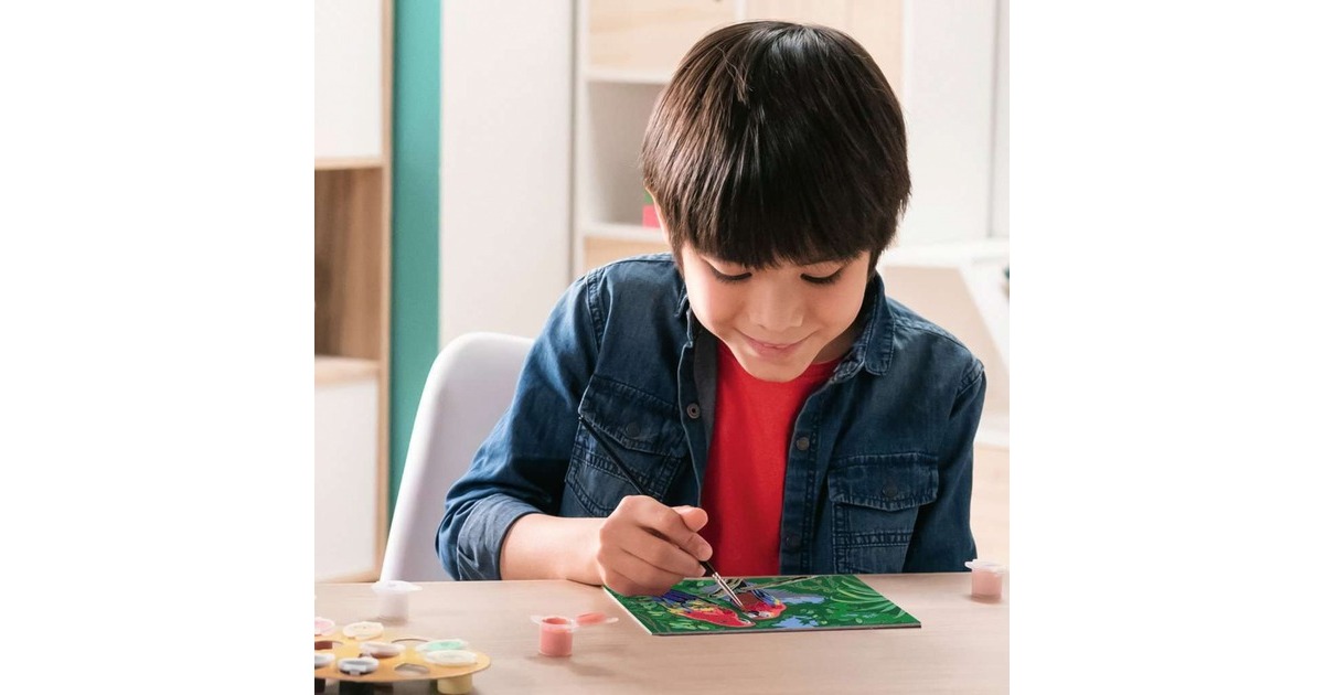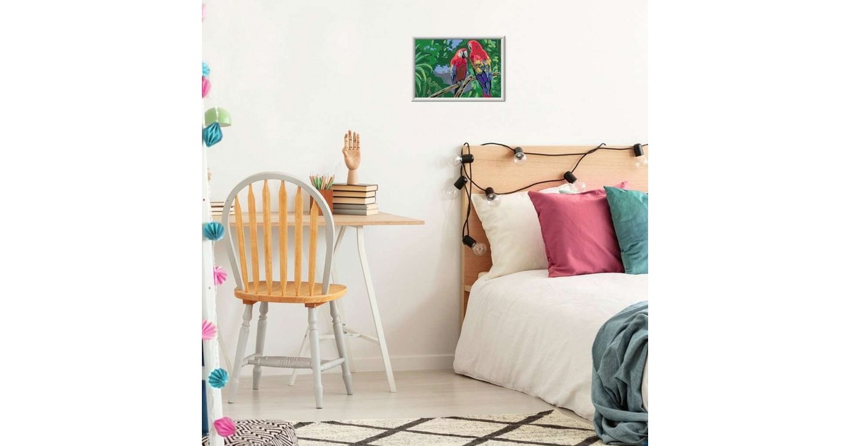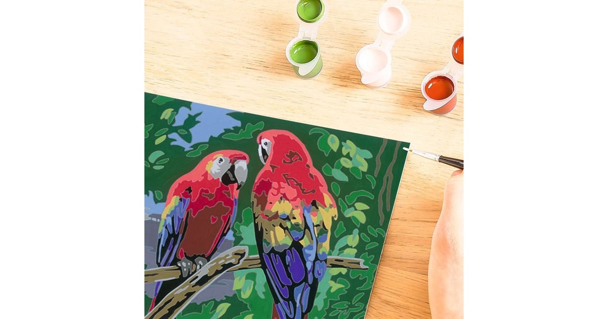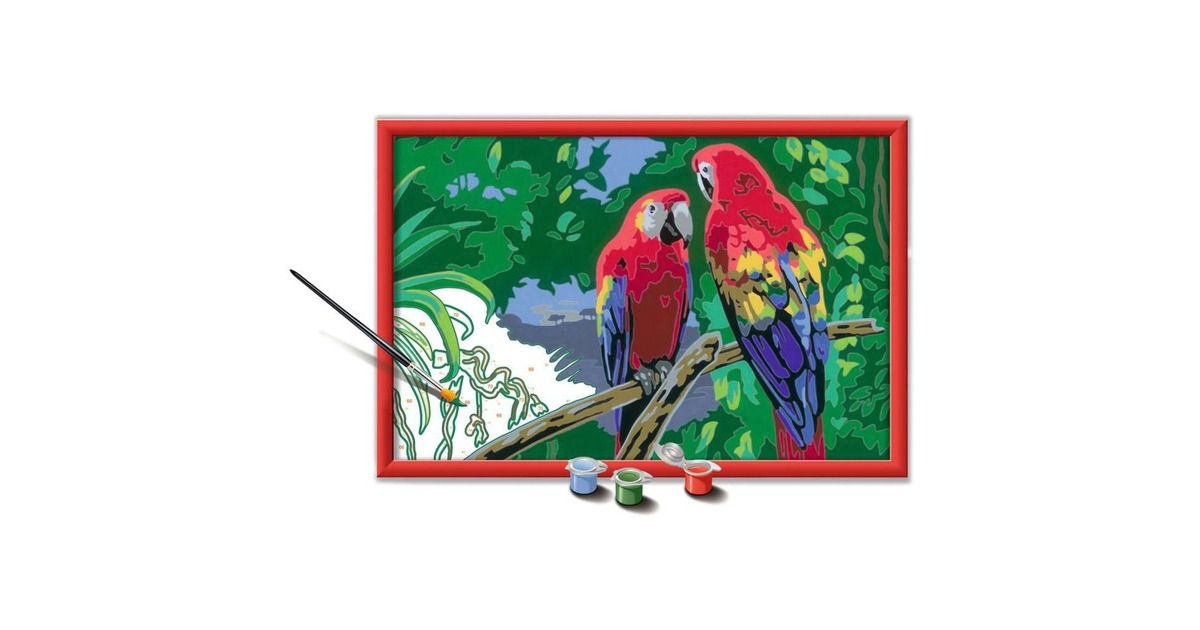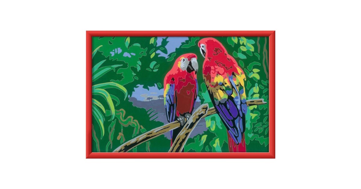 Mit Malen nach Zahlen aus dem Hause Ravensburger lernen Kinder, Flächen sorgfältig auszumalen. Damit verbessern sie ihr Maltalent und trainieren ihre feinmotorischen Fähigkeiten. Am Ende stehen Freude, Stolz und ein Erfolgserlebnis, das die Lust am Weitermalen weckt. Und nicht zuletzt ein dekoratives Bild fürs Kinderzimmer! Jedes Malset enthält alles, was zum sofortigen Loslegen benötigt wird. Ein Mischen der Farben ist nicht nötig. Mit diesem Set entsteht ein Motiv mit bunten Papageien in der Größe 31 x 21 Zentimeter. Ein Rahmen ist ebenfalls enthalten. Art.-Nr.: 100038923