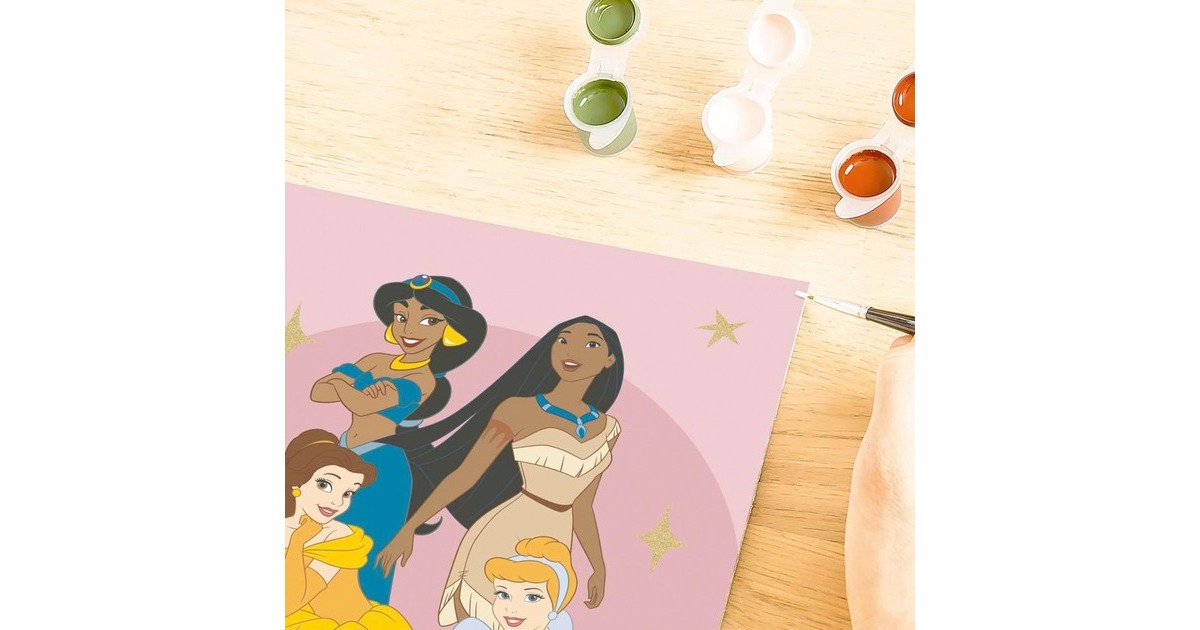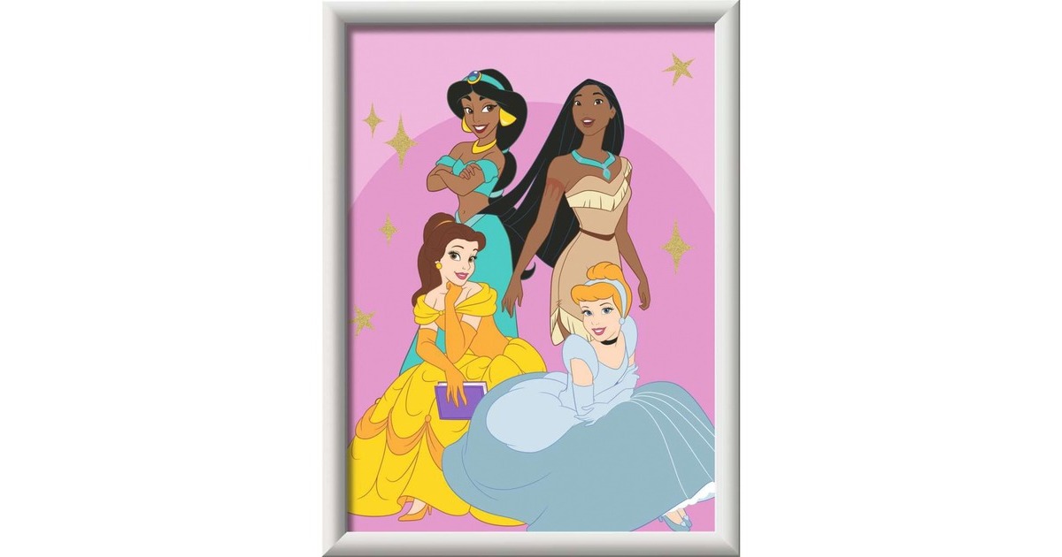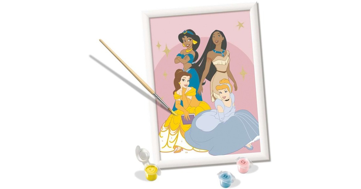 Mit Malen nach Zahlen aus dem Hause Ravensburger lernen Kinder, Flächen sorgfältig auszumalen. Damit verbessern sie ihr Maltalent und trainieren ihre feinmotorischen Fähigkeiten. Am Ende stehen Freude, Stolz und ein Erfolgserlebnis, das die Lust am Weitermalen weckt. Und nicht zuletzt ein dekoratives Bild fürs Kinderzimmer! Jedes Malset enthält alles, was zum sofortigen Loslegen benötigt wird. Ein Mischen der Farben ist nicht nötig. Mit diesem Set entsteht ein Motiv mit den Disney Prinzessinnen Jasmin, Pocahontas, Belle und Aschenputtel in der Größe 18 x 24 Zentimeter. Ein Rahmen ist ebenfalls enthalten. Art.-Nr.: 100038932