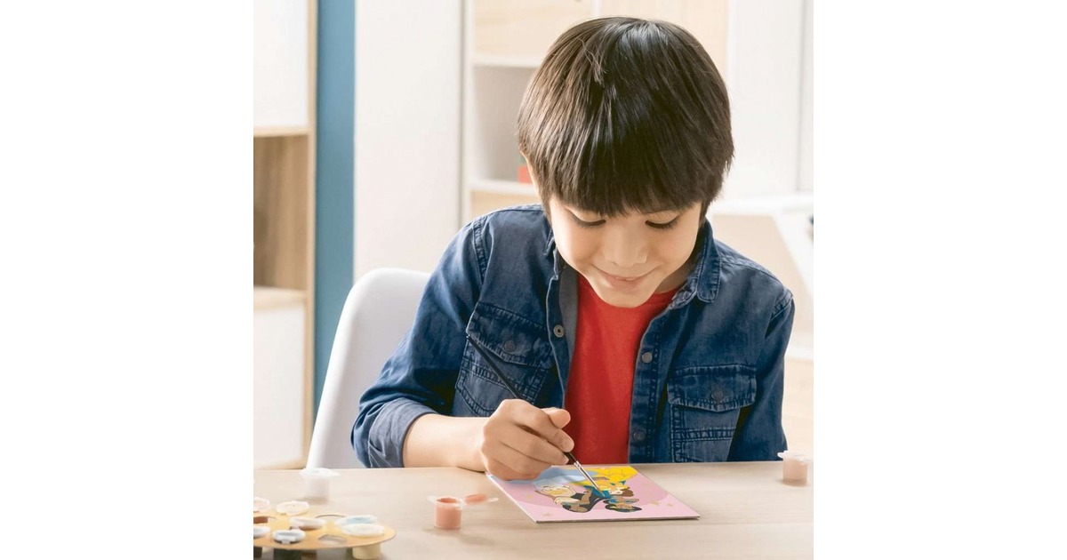 1 Maltafel (Format 18 x 24 cm), 14 Acrylfarben auf Wasserbasis in wiederverschließbaren Näpfchen, 1 Qualitätspinsel, Farbpalette, Rahmen, Vorlageblatt und Anleitung |