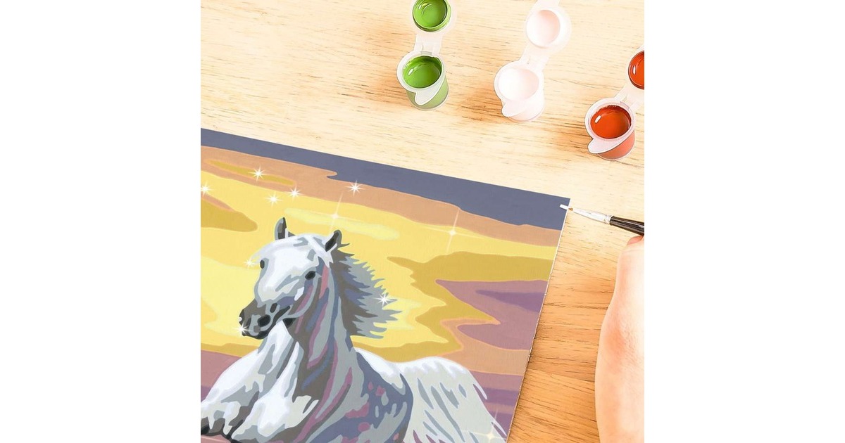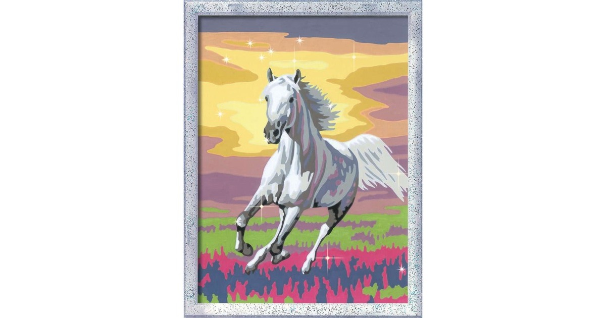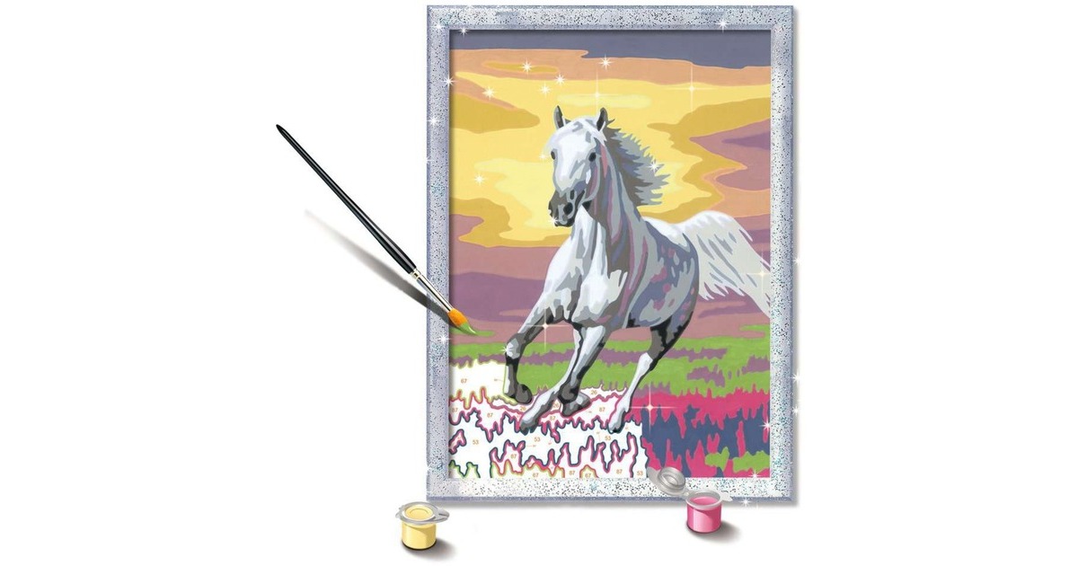 Mit Malen nach Zahlen aus dem Hause Ravensburger lernen Kinder, Flächen sorgfältig auszumalen. Damit verbessern sie ihr Maltalent und trainieren ihre feinmotorischen Fähigkeiten. Am Ende stehen Freude, Stolz und ein Erfolgserlebnis, das die Lust am Weitermalen weckt. Und nicht zuletzt ein dekoratives Bild fürs Kinderzimmer! Jedes Malset enthält alles, was zum sofortigen Loslegen benötigt wird. Ein Mischen der Farben ist nicht nötig. Mit diesem Set entsteht ein Motiv mit einem galoppierenden Schimmel in der Größe 18 x 24 Zentimeter. Ein Rahmen und Glitzer sind ebenfalls enthalten.Art.-Nr.: 100039092