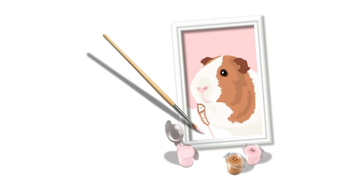 Mit Malen nach Zahlen aus dem Hause Ravensburger lernen Kinder, Flächen sorgfältig auszumalen. Damit verbessern sie ihr Maltalent und trainieren ihre feinmotorischen Fähigkeiten. Am Ende stehen Freude, Stolz und ein Erfolgserlebnis, das die Lust am Weitermalen weckt. Und nicht zuletzt ein dekoratives Bild fürs Kinderzimmer! Jedes Malset enthält alles, was zum sofortigen Loslegen benötigt wird. Ein Mischen der Farben ist nicht nötig. Mit diesem Set entsteht ein Motiv mit einem süßen Meerschweinchen in der Größe 8,5 x 12 Zentimeter. Ein Rahmen ist ebenfalls enthalten.Art.-Nr.: 100039086