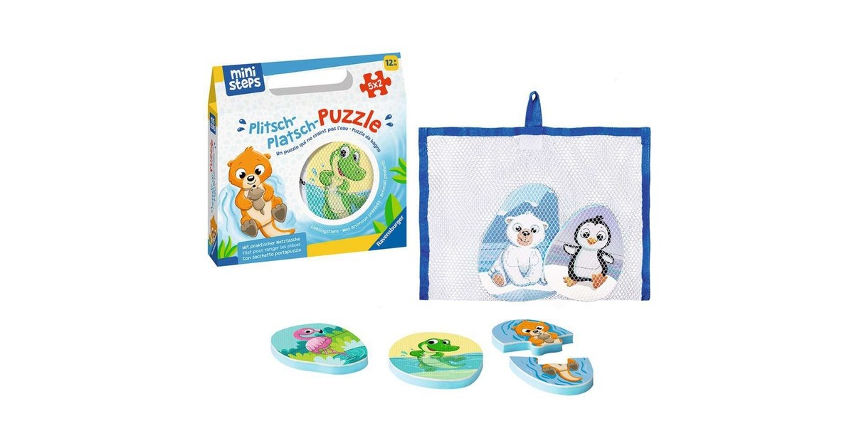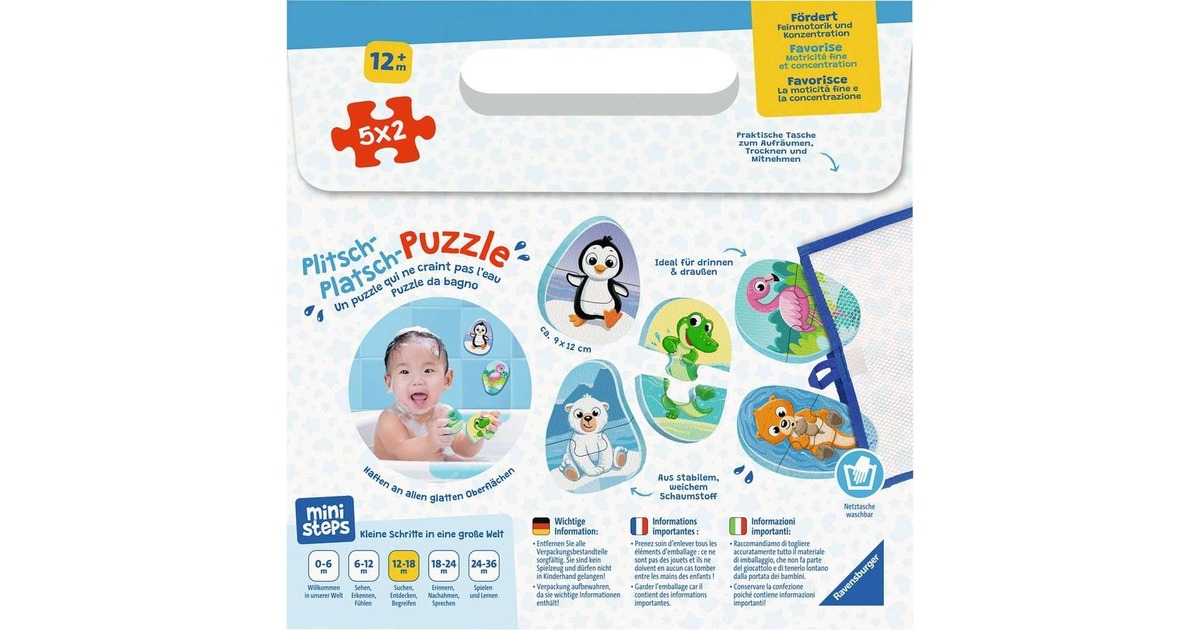 Riesiger Puzzlespaß mit besonderem Konzept für die Kleinsten: Die Puzzle der Serie Plitsch-Platsch-Puzzle von Ravensburger sind auch für die Badewanne geeignet. Die Teile aus dickem Schaumstoff haften an allen glatten Oberflächen und sind wasserfest - werden sie richtig zusammengesetzt, gibt es tolle Motive zu entdecken! Und ganz nebenbei wird die Feinmotorik und Konzentrationsfähigkeit von Kleinkindern gefördert. Dieses Set enthält zehn Teile mit verschiedenen Tieren, die zu fünf Puzzles zusammengesetzt werden können. Art.-Nr.: 100038710