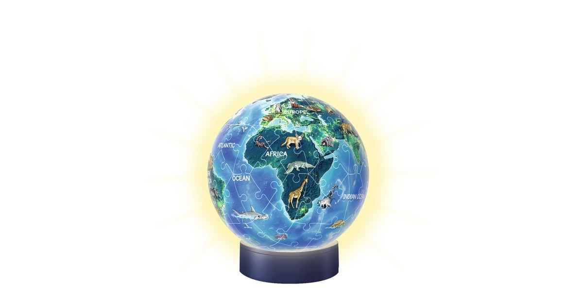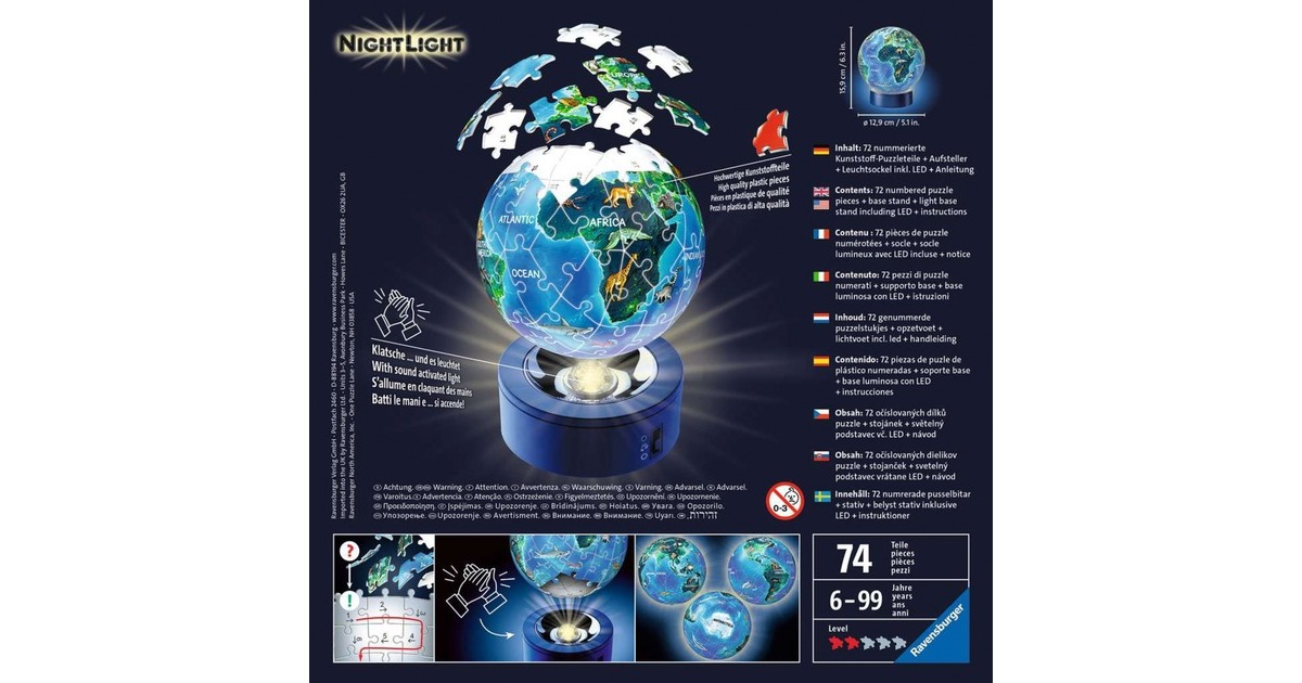 Die farbenfrohe Kindererde wird mit einem Händeklatschen zum außergewöhnlichen Nachtlicht, wenn der Leuchtsockel den Ball von innen erstrahlen lässt. Dank unserer Easyclick Technology passen alle Kunststoff-Puzzleteile perfekt ineinander und formen eine stabile Kugel, ganz ohne Kleben. Die Nummerierung der Teile erleichtert das Vorsortieren und ermöglicht einfaches Puzzeln nach Zahlen.