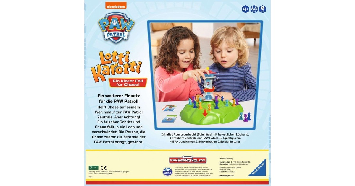 Ein neuer Einsatz für die Retter auf vier Pfoten! Schnell macht sich Chase auf den Weg hinauf zur Kommando-Zentrale. Doch der Weg durch die Abenteuer-Bucht steckt diesmal voller Überraschungen. Während des Spiels wird der Turm immer wieder gedreht. Dadurch verändert sich der Weg: Sicher geglaubte Lauffelder öffnen sich plötzlich und - plumps! - schon ist eine der Spielfiguren im Hügel verschwunden. Wer erreicht mit seiner Spielfigur das Zielfeld oben am Turm als Erster? Der bekannte Klassiker Lotti Karotti steht hier mit den Serienlieblingen aus Paw Patrol bereit. Ein spannender Hindernislauf für Kinder ab 4 Jahren.Art.-Nr.: 1912805