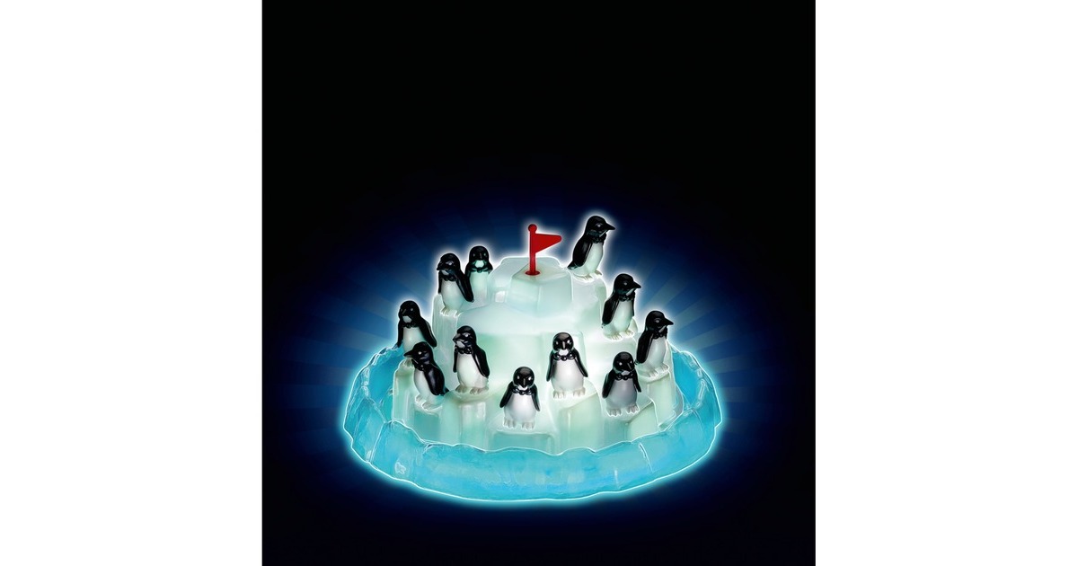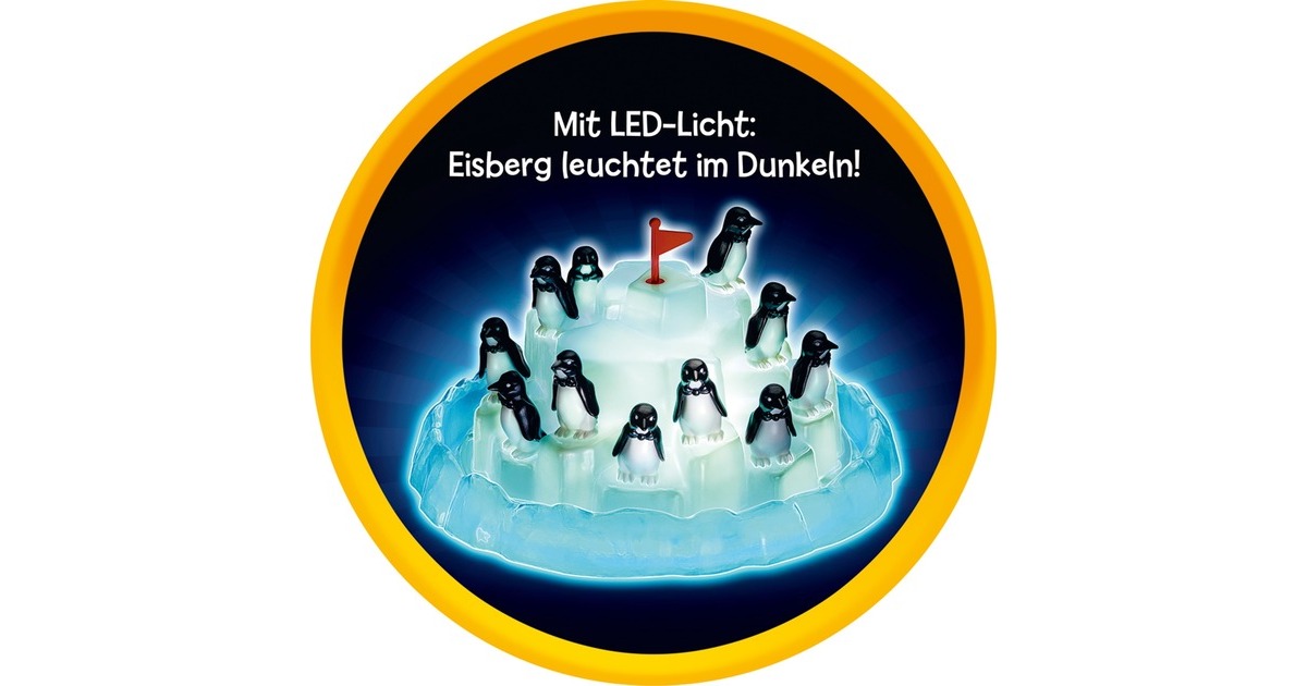 1 Spielbasis aus transluzentem Material, 1 Eisberg mit Fahne, 1 LED-Lampe, 20 Pinguine, 1 Pappring |