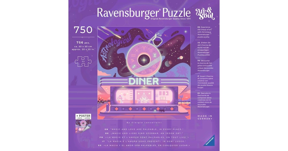 Puzzles von Ravensburger bringen Puzzlespaß in Premiumqualität: Sie erfüllen die höchsten Ansprüche an Material, Motiv und Design - und dies mit einer riesigen Auswahl an Motiven, Formaten und Schwierigkeitsgraden. Hier findet jeder sein perfektes Puzzle: Vom Anfänger bis zum Profi. Die Puzzles aus der Art & Soul-Sammlung zeigen künstlerische Illustrationen in verschiedenen Stilen und zu ganz unterschiedlichen Themen. Über ein beiliegendes Poster sind weitere Informationen zu Werk und Künstler enthalten. Die Puzzles bestehen jeweils aus 750 Teilen und kommen im quadratischen Format mit 50 x 50 Zentimetern. Art.-Nr.: 100038044