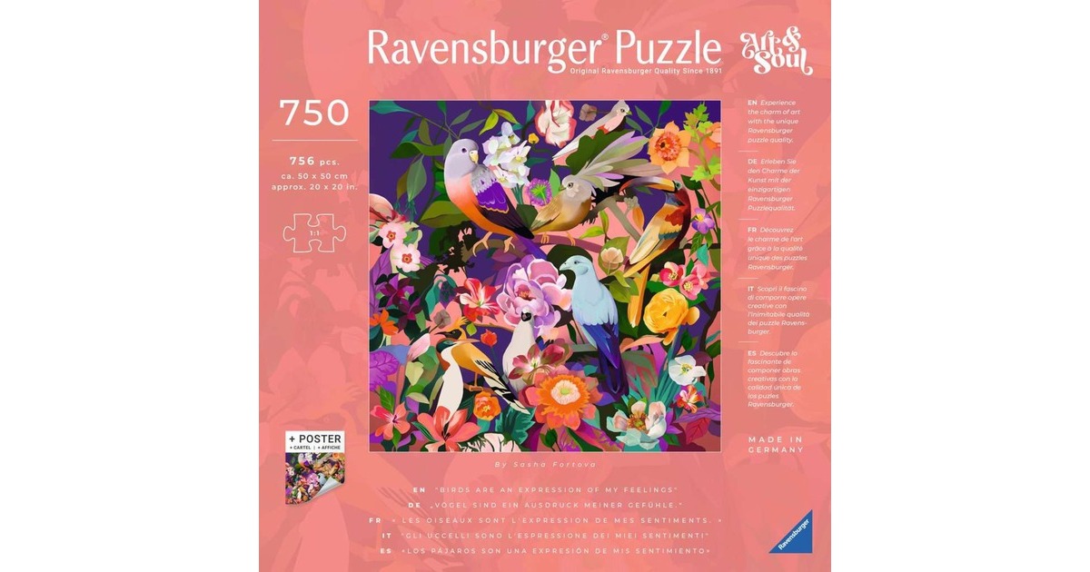 Puzzles von Ravensburger bringen Puzzlespaß in Premiumqualität: Sie erfüllen die höchsten Ansprüche an Material, Motiv und Design - und dies mit einer riesigen Auswahl an Motiven, Formaten und Schwierigkeitsgraden. Hier findet jeder sein perfektes Puzzle: Vom Anfänger bis zum Profi. Die Puzzles aus der Art & Soul-Sammlung zeigen künstlerische Illustrationen in verschiedenen Stilen und zu ganz unterschiedlichen Themen. Über ein beiliegendes Poster sind weitere Informationen zu Werk und Künstler enthalten. Die Puzzles bestehen jeweils aus 750 Teilen und kommen im quadratischen Format mit 50 x 50 Zentimetern. Art.-Nr.: 100038036