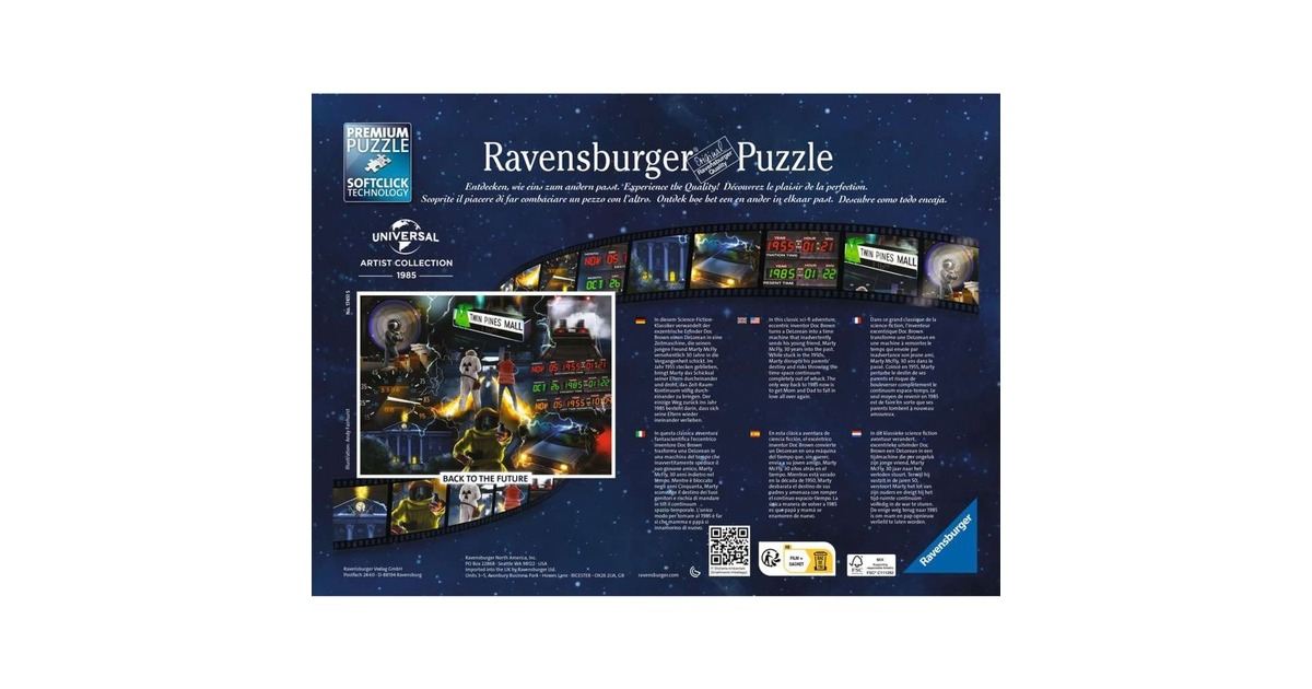Puzzles von Ravensburger bringen Puzzlespaß in Premiumqualität: Sie erfüllen die höchsten Ansprüche an Material, Motiv und Design - und dies mit einer riesigen Auswahl an Motiven, Formaten und Schwierigkeitsgraden. Hier findet jeder sein perfektes Puzzle: Vom Anfänger bis zum Profi. Dieses Puzzle mit 1000 Teilen zeigt verschiedene Motive aus den Filmen der Reihe "Zurück in die Zukunft".Art.-Nr.: 1894811
