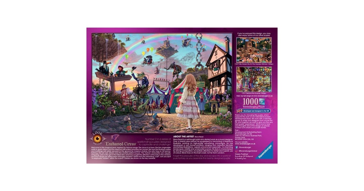 Das Ravensburger Puzzle "Der verzauberte Zirkus" ist für Liebhaber von Puzzlespielen ab 14 Jahren geeignet. Mit 1000 Teilen bietet es eine anspruchsvolle Herausforderung und ermöglicht stundenlangen Puzzlespaß. Das Puzzle hat eine Größe von 70 x 50 cm und beeindruckt mit einem zauberhaften Zirkusmotiv. Die hochwertige Verarbeitung der Teile sorgt dafür, dass sie perfekt zusammenpassen und ein stabiles Gesamtbild ergeben. Tauche ein in die magische Welt des Zirkus und lass Dich von diesem faszinierenden Puzzle begeistern!Art.-Nr.: 100037493