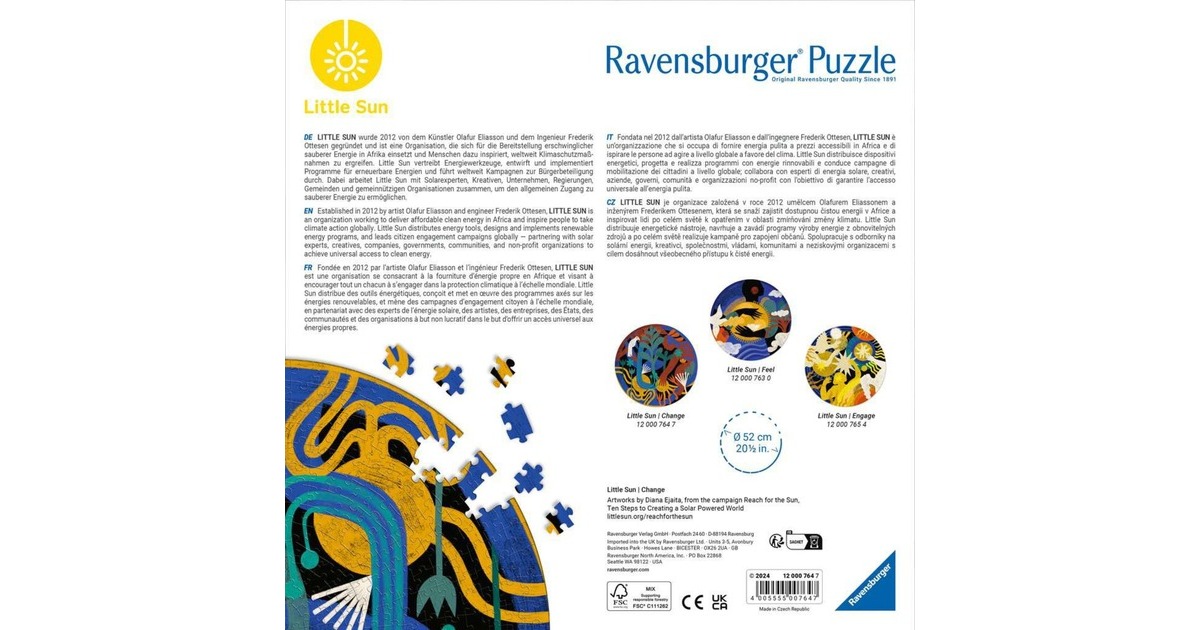 Ravensburger Puzzles für Erwachsene stehen für Premium-Qualität. Sie sind damit die erste Wahl für Anfänger, Fortgeschrittene oder Profis - für jeden Liebhaber von Puzzles gibt es das passende Motiv und die richtige Teilezahl. Den hohen Qualitätsanspruch erfüllt Ravensburger durch Nutzung hochpräziser Stanzwerkzeuge. So passen alle Teile perfekt ineinander, während das haltbare Material eine lange Lebensdauer verspricht. Dieses runde Puzzle aus der Reihe Little Sun hat 500 Teilen, misst 52 x 52 Zentimeter und zeigt eine abstrakte Darstellung mit Natur-Elementen und einem Menschen, der seine Hand nach der Sonne ausstreckt. Litte Sun ist eine Organisation, die sich für den Einsatz sauberer und erschwinglicher Energie in Afrika einsetzt. Die Motive dieser Puzzle-Serie stammen aus der Kampagne "Reach for the Sun".Art.-Nr.: 100039193