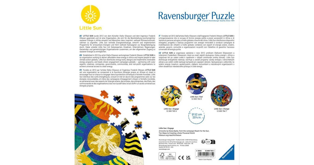 Ravensburger Puzzles für Erwachsene stehen für Premium-Qualität. Sie sind damit die erste Wahl für Anfänger, Fortgeschrittene oder Profis - für jeden Liebhaber von Puzzles gibt es das passende Motiv und die richtige Teilezahl. Den hohen Qualitätsanspruch erfüllt Ravensburger durch Nutzung hochpräziser Stanzwerkzeuge. So passen alle Teile perfekt ineinander, während das haltbare Material eine lange Lebensdauer verspricht. Dieses Puzzle aus der Reihe Little Sun hat 500 Teilen, misst 52 x 52 Zentimeter und zeigt die abstrakte Darstellung mehrerer Menschen, die ihre Hände nach den Sternen und der Sonne ausstrecken. Litte Sun ist eine Organisation, die sich für den Einsatz sauberer und erschwinglicher Energie in Afrika einsetzt. Die Motive dieser Puzzle-Serie stammen aus der Kampagne "Reach for the Sun".Art.-Nr.: 100039198