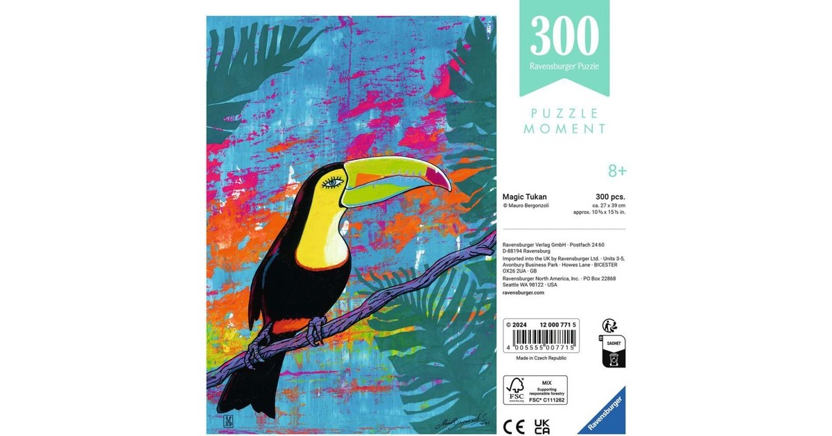 Die Ravensburger Puzzle aus der Serie Puzzle Moments sorgen für Entspannung im stressigen Alltag: Sie bieten mit trendigen Motiven und Premium-Qualität ein entspannendes Erlebnis für Zwischendurch - oder auch: Einen Moment für sich selbst. Es gibt sie in verschiedenen Größen - für Puzzle-Neulinge oder für erfahrene Puzzle-Fans, als ganz entspannten Einstieg oder als kleinere Herausforderung. Dieses Puzzle mit 300 Teilen ist 39 x 27 cm groß und zeigt einen bunten Tukan vor einer Kulisse mit Palmwedeln.Art.-Nr.: 100039138