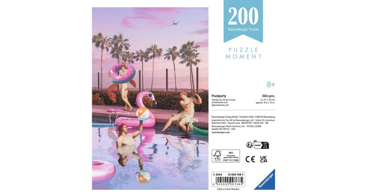 Die Ravensburger Puzzle aus der Serie Puzzle Moments sorgen für Entspannung im stressigen Alltag: Sie bieten mit trendigen Motiven und Premium-Qualität ein entspannendes Erlebnis für Zwischendurch - oder auch: Einen Moment für sich selbst. Es gibt sie in verschiedenen Größen - für Puzzle-Neulinge oder für erfahrene Puzzle-Fans, als ganz entspannten Einstieg oder als kleinere Herausforderung. Dieses Puzzle mit 200 Teilen ist 21 x 33 cm groß und zeigt ein Pooparty-Motiv mit klassischen Figuren in einem Pool mit Aufblas-Flamingo.Art.-Nr.: 100039127