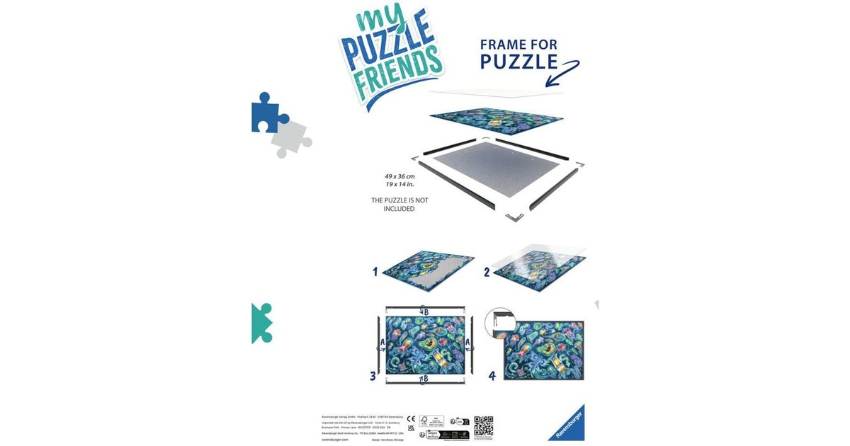 Wer träumt nicht davon, das Lieblingspuzzles einzurahmen? Der Ravensburger Puzzle-Rahmen wurde speziell dafür entwickelt. Er passt perfekt zu den 1000 Teile Puzzles und ermöglicht es, die Lieblingsmotive nach dem Puzzeln ganz einfach einzurahmen und aufzuhängen. Gepuzzelt wird direkt auf der Pappunterlage, bevor die Rahmenteile montiert werden.Art.-Nr.: 100039145