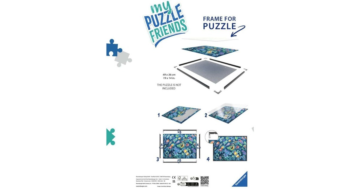 Wer träumt nicht davon, das Lieblingspuzzles einzurahmen? Der Ravensburger Puzzle-Rahmen wurde speziell dafür entwickelt. Er passt perfekt zu den 500 Teile Puzzles und ermöglicht es, die Lieblingsmotive nach dem Puzzeln ganz einfach einzurahmen und aufzuhängen. Gepuzzelt wird direkt auf der Pappunterlage, bevor die Rahmenteile montiert werden.Art.-Nr.: 100039141