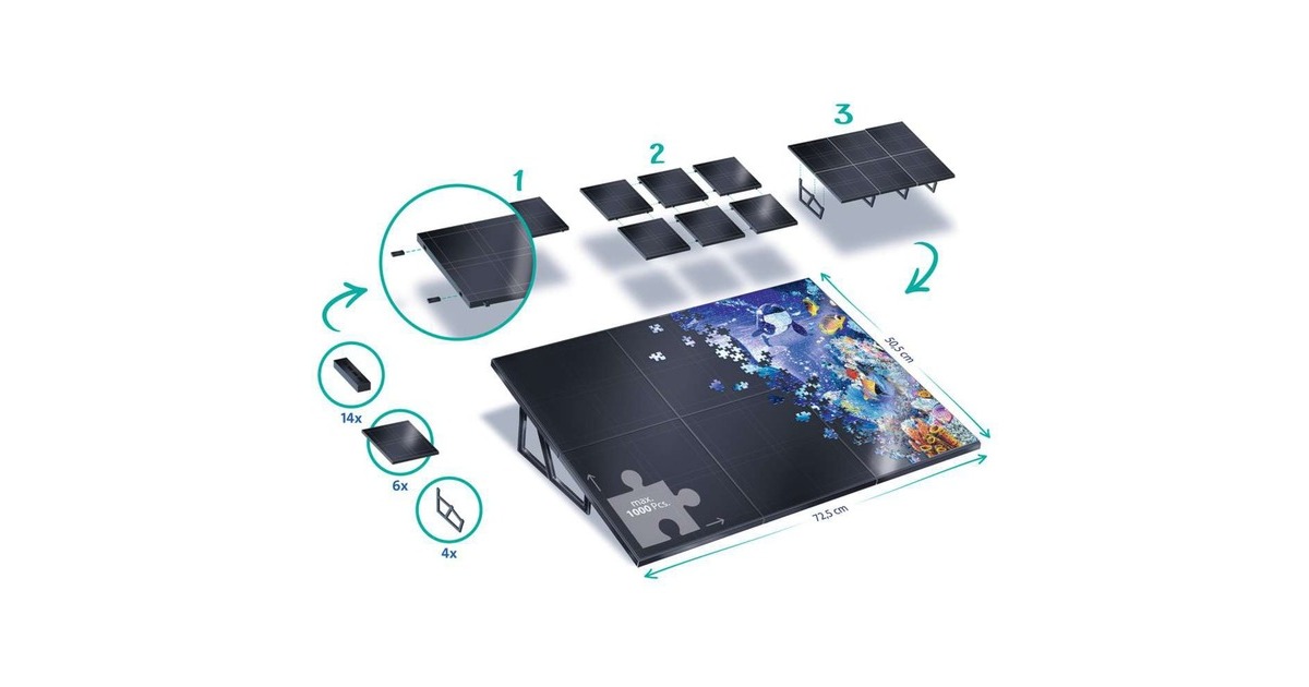 Auspacken, zusammenstecken, lospuzzeln! Mit diesem praktischen Puzzle-Zubehör können es sich Puzzler jetzt so richtig bequem machen. Egal ob am Schreib-, Küchen-, Wohnzimmertisch oder doch lieber direkt auf dem Fußboden: Die Puzzle Staffelei ist individuell einsetzbar und macht Puzzeln an jedem beliebigen Ort möglich. Die rutschfeste Oberfläche verhindert dabei das Herunterfallen der Teile - so bleibt alles am richtigen Platz. Mit der Ravensburger Puzzle Staffelei erhalten Sie ein gut durchdachtes Zubehör für viele schöne Puzzle-Stunden, das auch optisch Freude bereitet. Denn das Board besteht aus edlem Schwarz, ist zu 98% aus recyceltem Material und stabil, aber trotzdem so leicht, dass es einfach transportiert werden kann. Die ergonomische Staffelei ist auf die Größe eines 1000 Teile Puzzles im Querformat ausgelegt.Art.-Nr.: 1629130