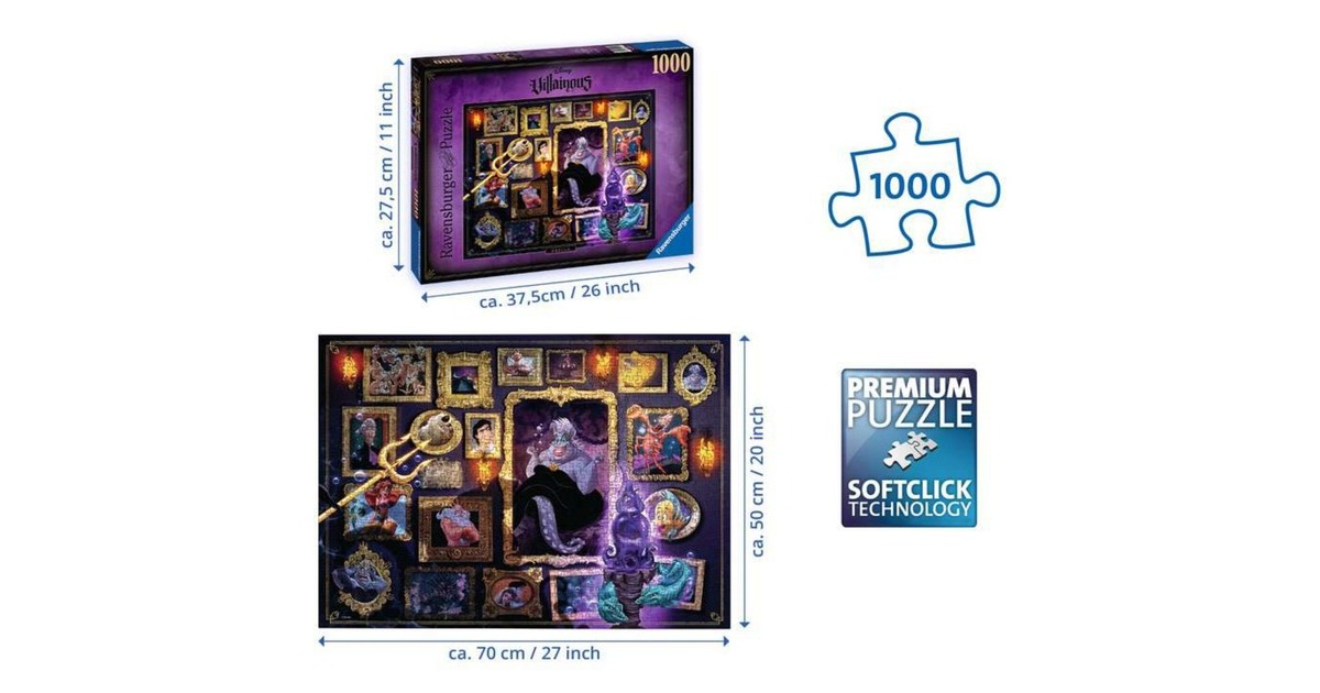 Puzzles von Ravensburger bringen Puzzlespaß in Premiumqualität: Sie erfüllen die höchsten Ansprüche an Material, Motiv und Design - und dies mit einer riesigen Auswahl an Motiven, Formaten und Schwierigkeitsgraden. Hier findet jeder sein perfektes Puzzle: Vom Anfänger bis zum Profi. Dieses Puzzle mit 1000 Teilen zeigt verschiedene Motive aus der Welt von Disney Villainous: Im Zentrum steht Ursula aus dem Film "Arielle die Meerjungfrau". Art.-Nr.: 100019894